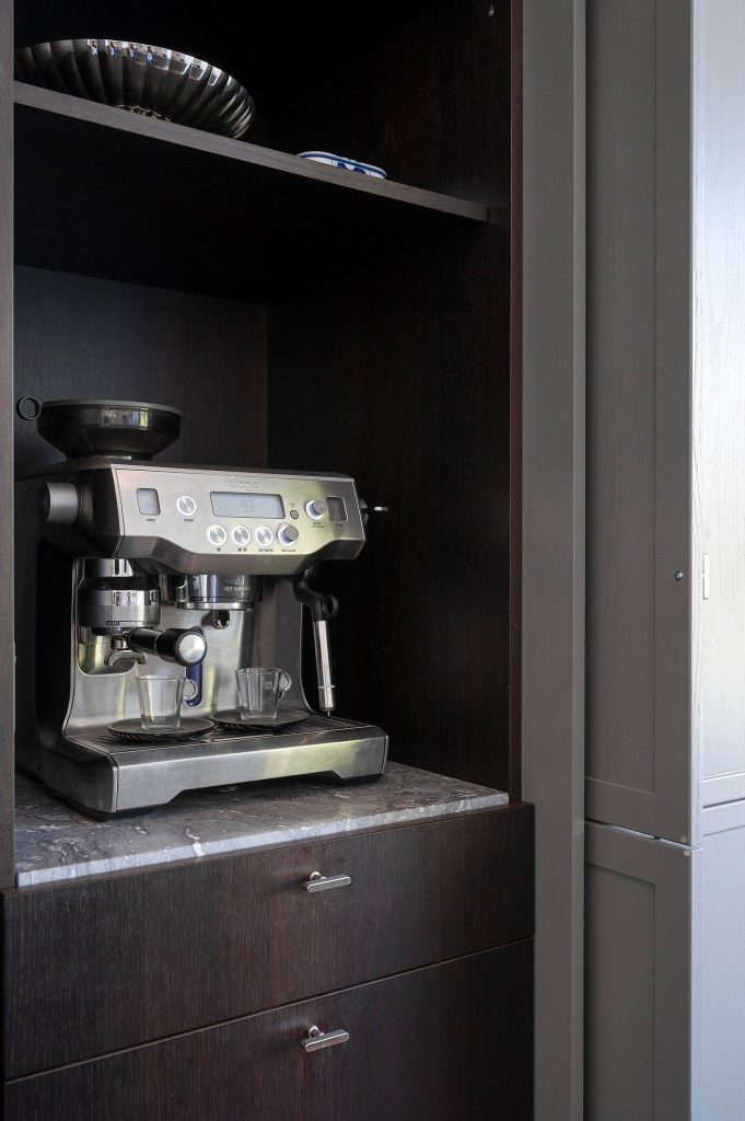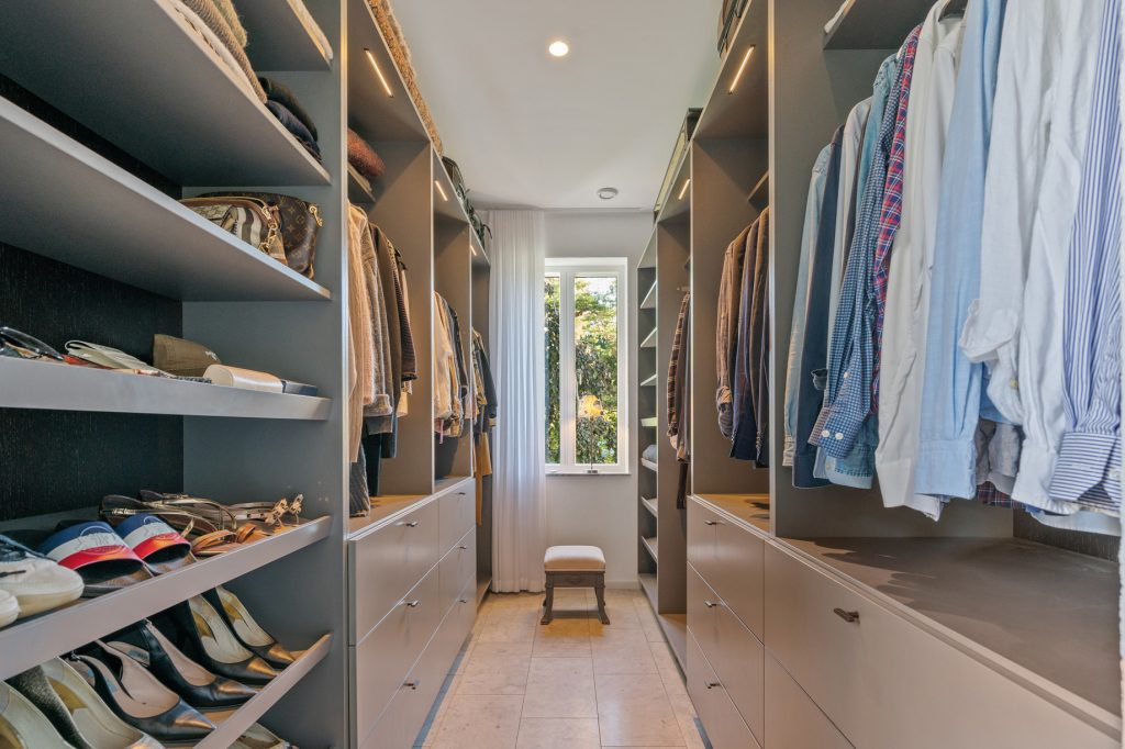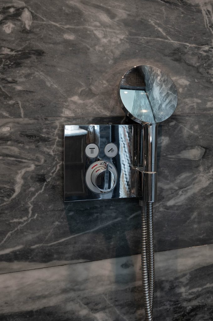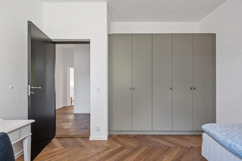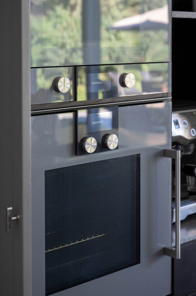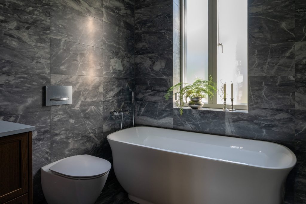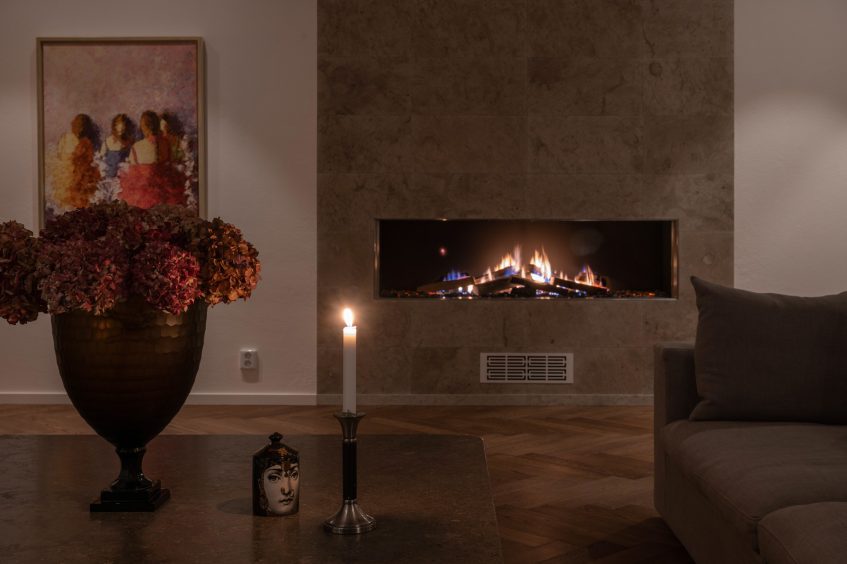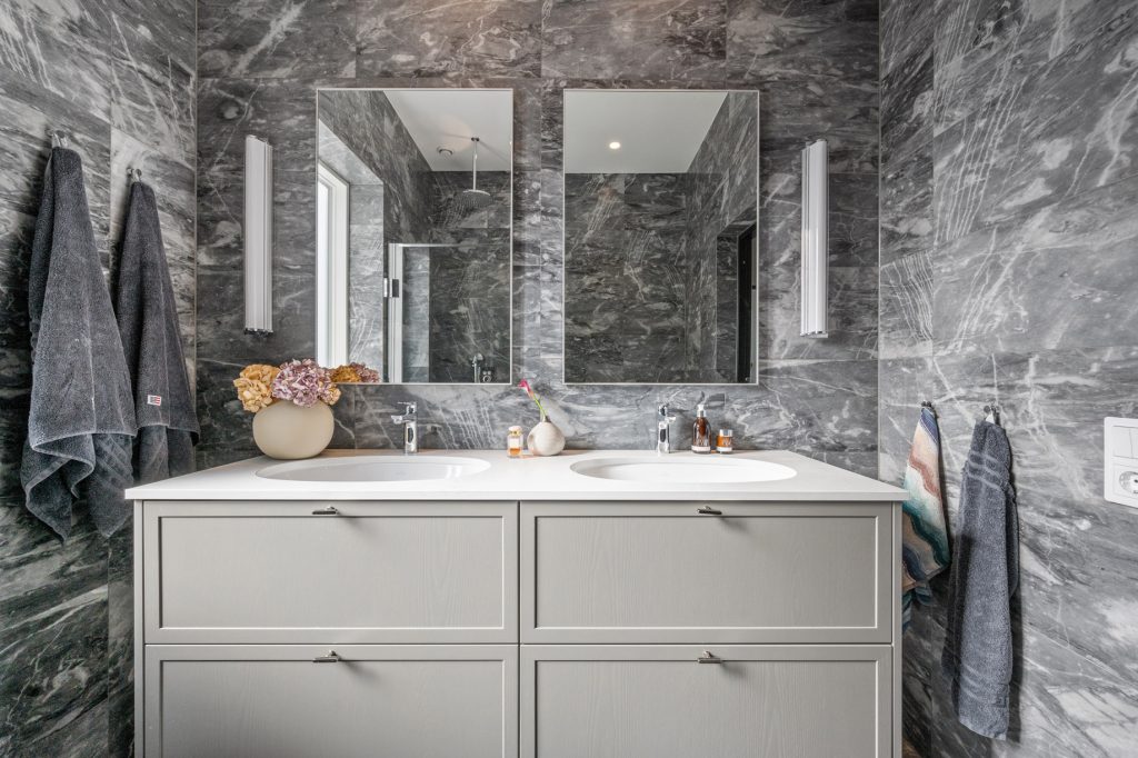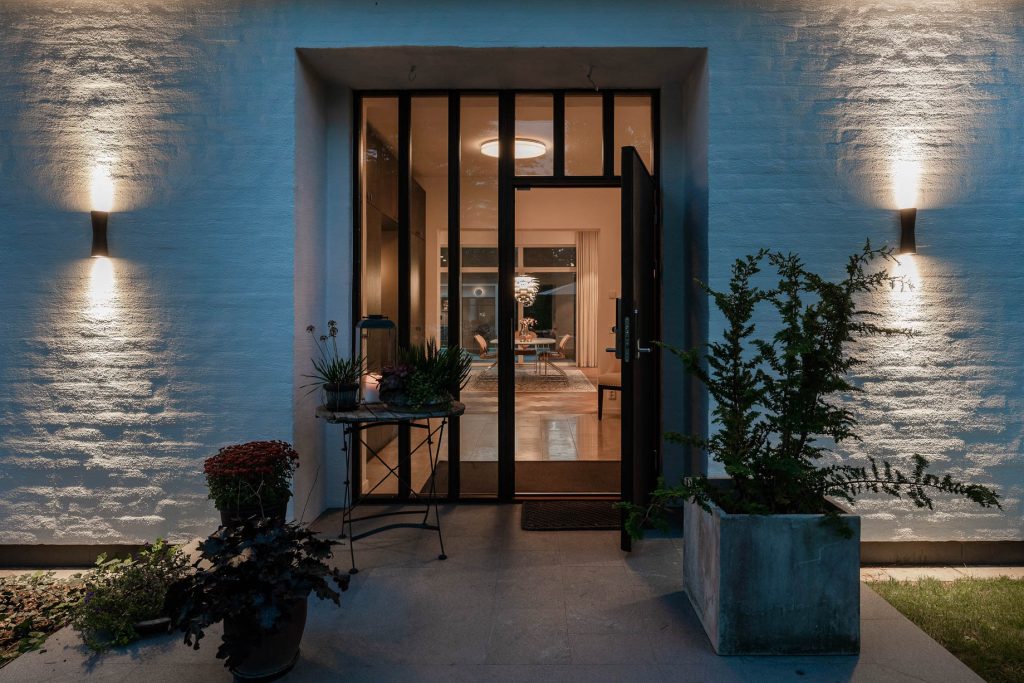 Upon entering the house through the specially ordered door from Bovallsdörren, guests are greeted by a grand entrance hall with built-in wardrobes and a seating area. The interior walls of the house are painted with Farrow & Ball Estate Emulsion, which gives a soft finish and a great depth of color. The living room, which is approximately 78 square meters, seamlessly integrates with the kitchen and boasts Velfac windows with lift/slide sliding doors that blur the line between inside and out. A gas stove from RAIS beautifully adorns the marble wall, adding a touch of elegance to the space.