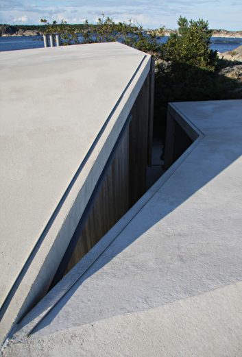 As the island is only accessible by boat, the main entrance to the house is placed on the south side to establish a gentle axis to the private beach. The concealed lights in the bollards lead down to the water in the evening welcoming those arriving from the sea. The existing vegetation was also carefully preserved, and the volume of the building has been defined in harmony with the surroundings.