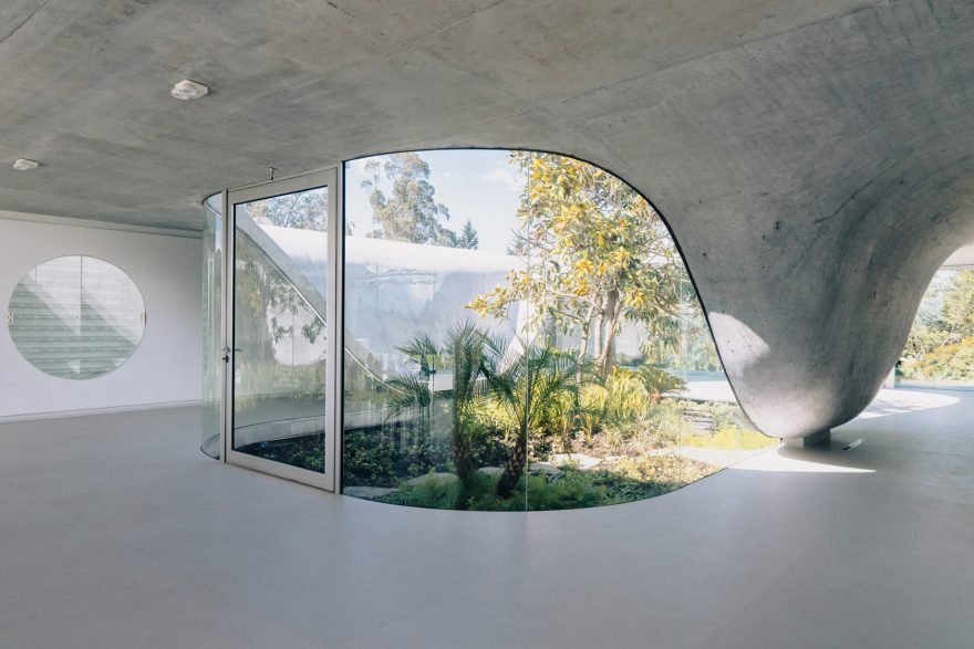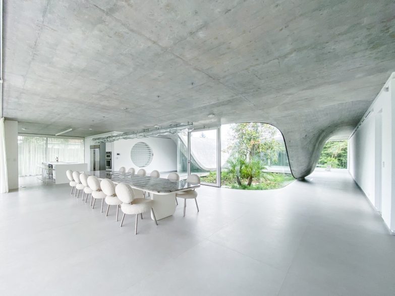 The roof folds towards the central courtyard, making it the organic heart of the house through a sculptural gesture with open views from the sky. The house absorbs and expresses the environment with wide spaces without columns that allow an opening towards the landscape, viewed from afar, as if a spaceship has landed.
