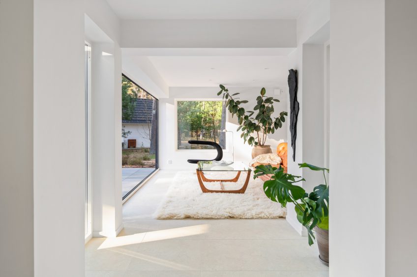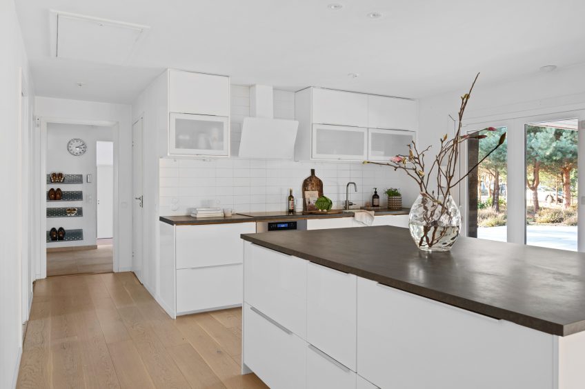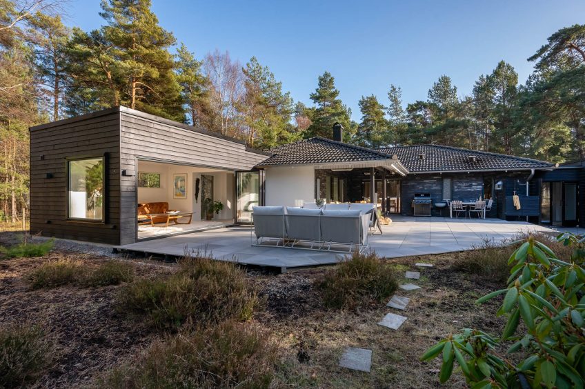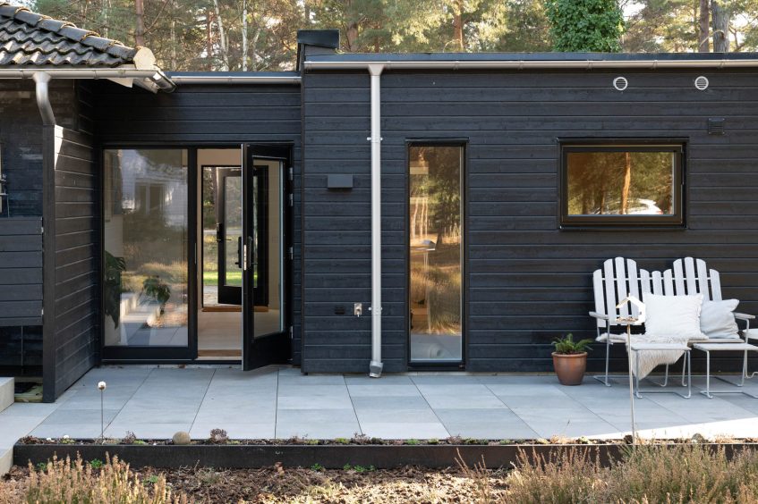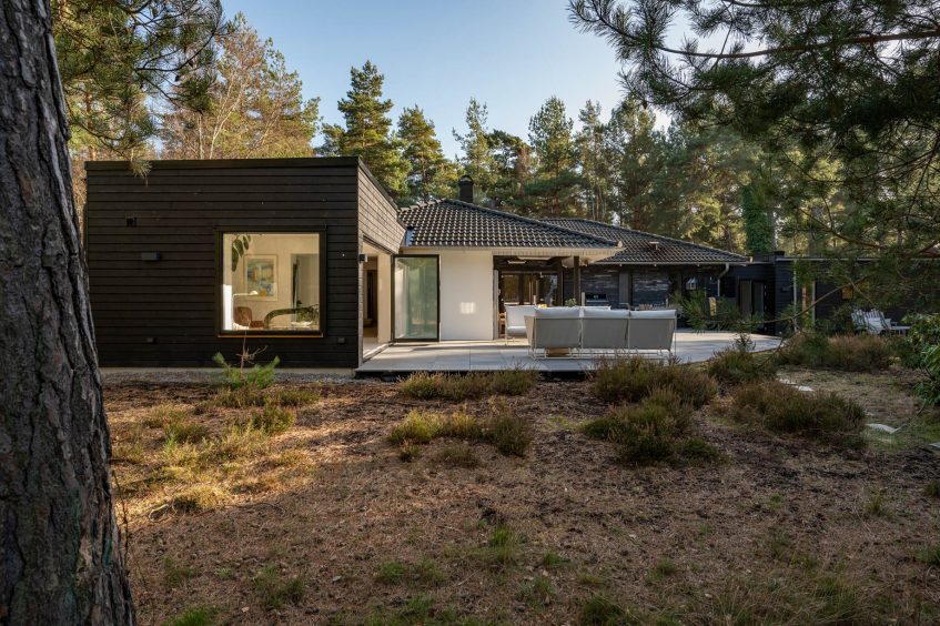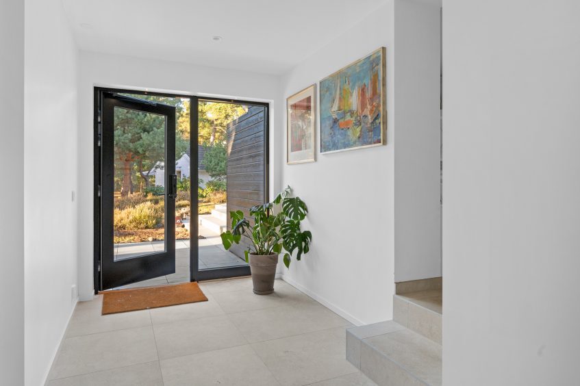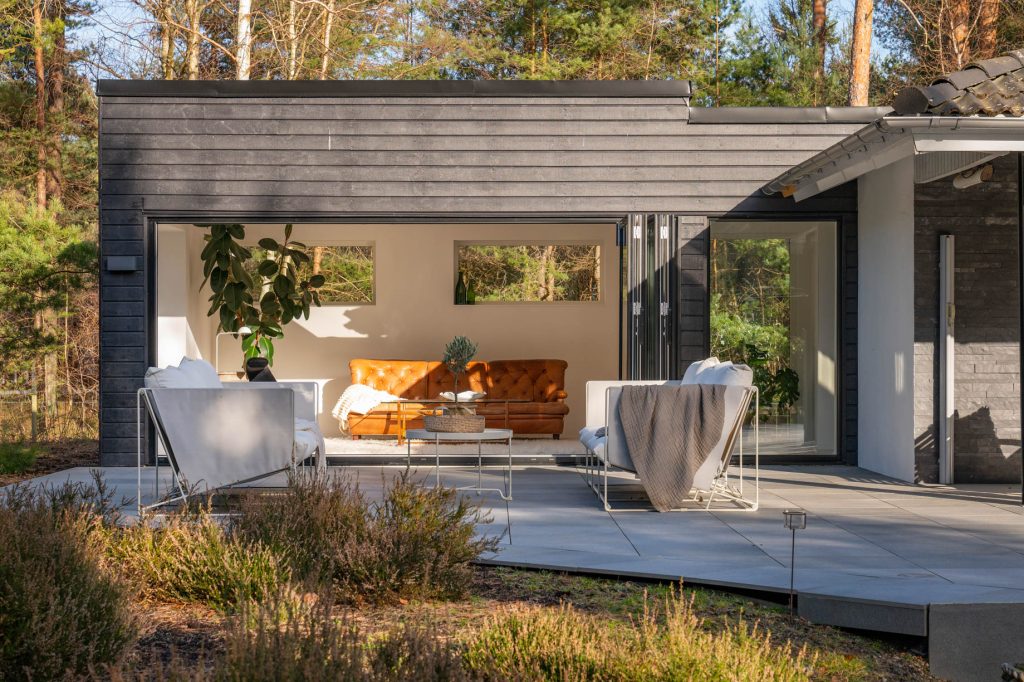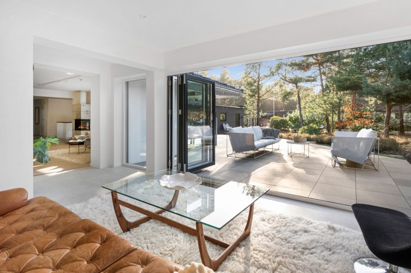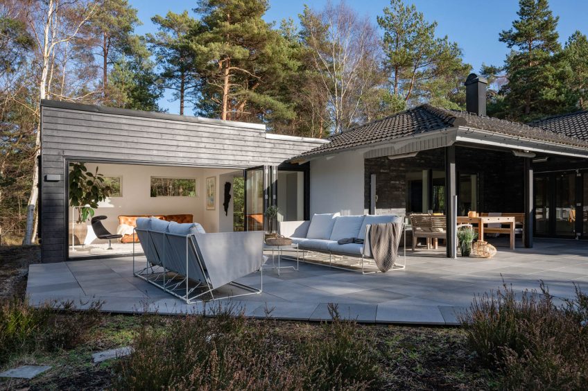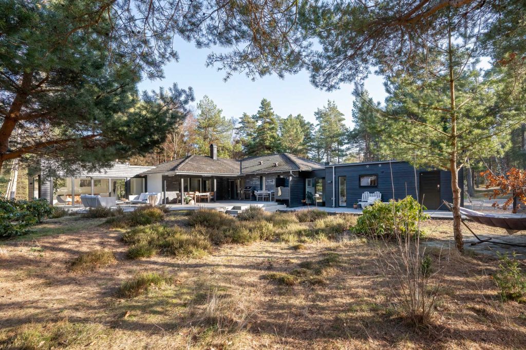 This elegant single-story villa is nestled among heather and pine, providing a serene and tranquil living experience with all the modern comforts you could desire. Along with the charming living areas and a chef’s dream kitchen, the villa boasts four bedrooms and ample space for a home office. The living room features a cozy fireplace, while the stylishly designed conservatory with folding doors creates an inviting atmosphere. The open and practical layout of the villa offers a warm and bright ambiance, perfect for comfortable living. Every detail has been carefully considered in the design of this stylish and cozy villa, making it a true gem. The lush outdoor environment is thoughtfully planned, featuring beautiful plantings, shrubs, and greenery, creating a leafy and sheltered haven.