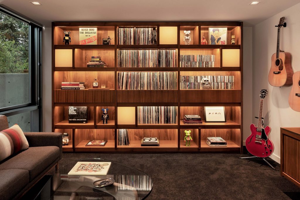 Step inside, and you’ll be greeted by an interior that is open, luminous, and designed to facilitate entertaining. The main level features a grand foyer that leads to a spacious great room, complete with a two-story flamed granite fireplace, custom built-in shelving, and a massive 40-foot-wide sliding door that seamlessly connects the interior with the patio area. Adjacent to the great room, a sleek kitchen, a generous 12-seat dining table, and a custom coffee and spirits bar offer the perfect space for hosting gatherings and creating lasting memories. Ascending to the second story, you’ll find a bedroom wing and an office wing, interconnected by a captivating bridge element. The primary bedroom boasts a balcony that overlooks the backyard and provides breathtaking views of the surrounding mountains. Additionally, the residence caters to the client’s passion for music, featuring a first-floor music room with custom shelving and a comfortable space to relax and enjoy their extensive collection.