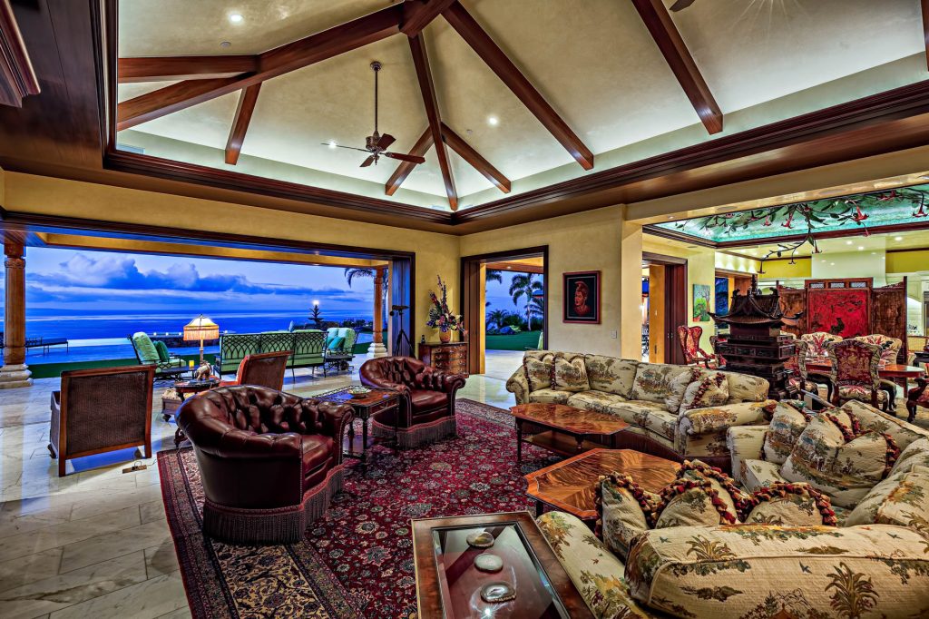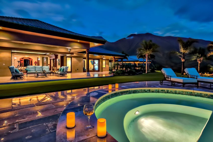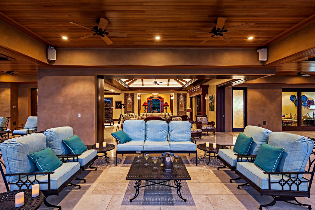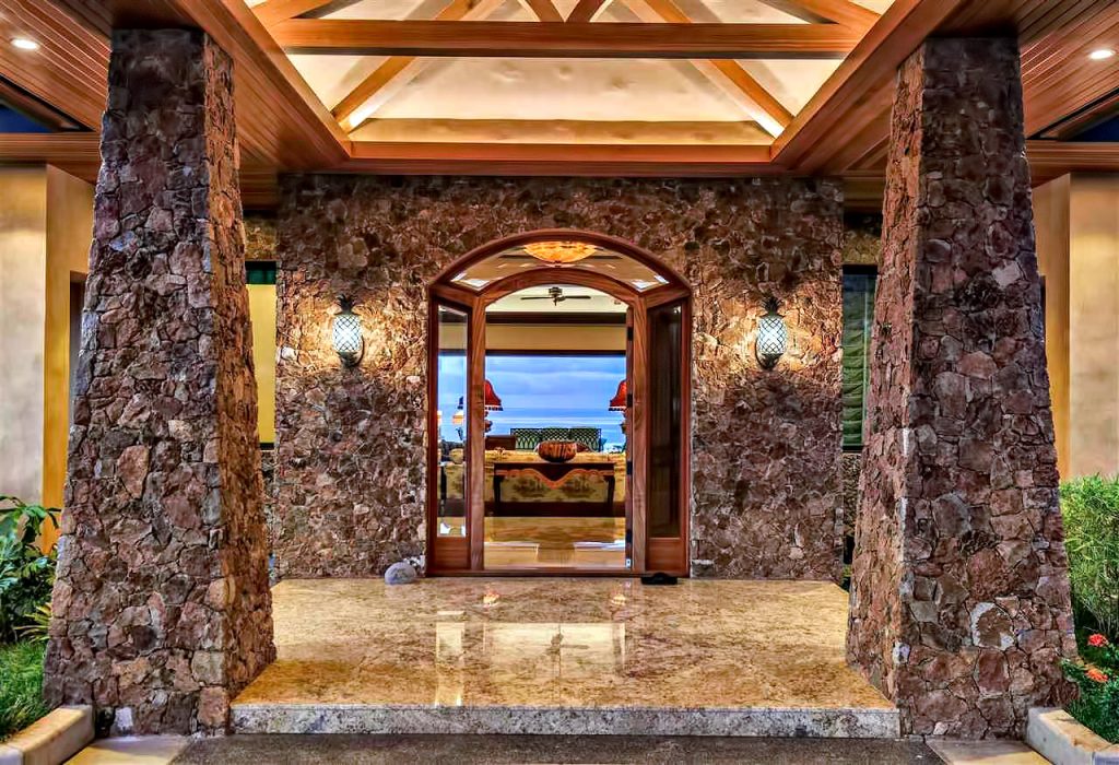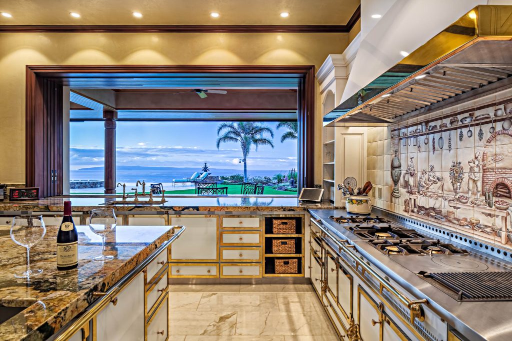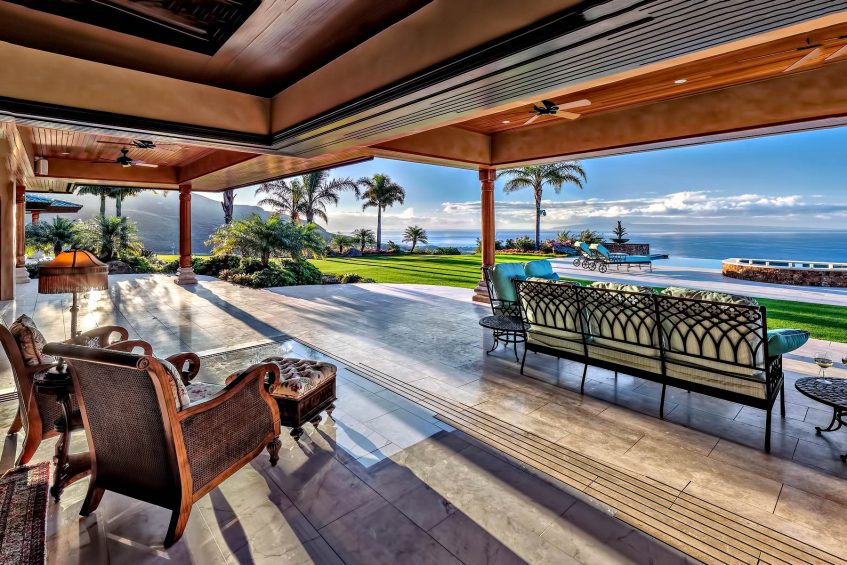 The endless panoramic views, overlooking the stunning infinity pool, bask in sunlit picture-perfect canvas that stretches from South Maui, to the crescent island of Molokini and out to Kahoolawe, Lanai and beyond to the horizon of the clear blue Pacific Ocean as far as the eye can see. Entertain in tropical style within the lush gardens of the estate or under the cool shade of the extensive travertine covered patios or the exterior pavilion with an outdoor pizza over that is perfect for al fresco dining.