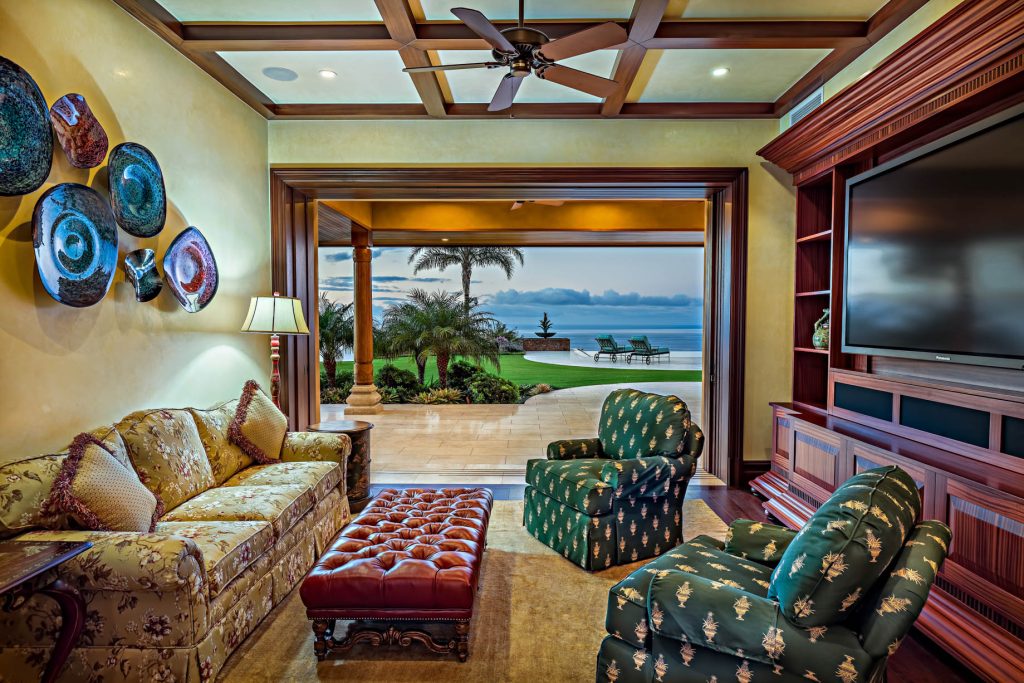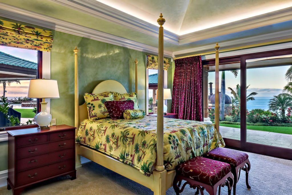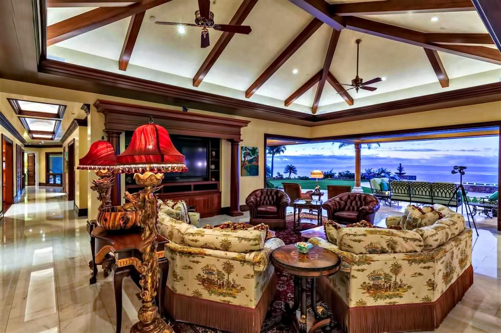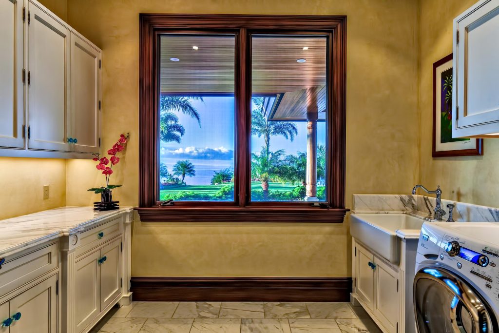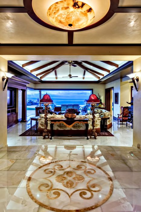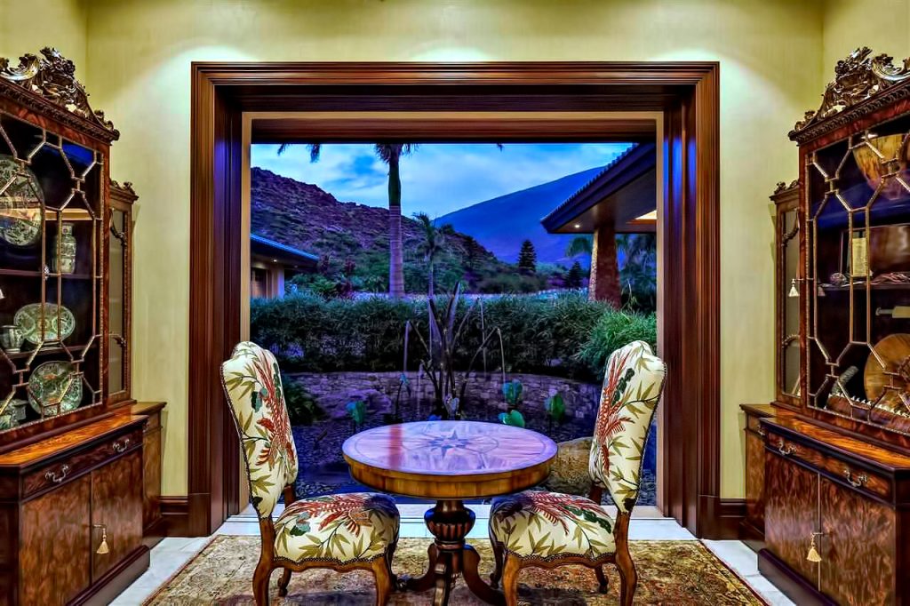 The endless panoramic views, overlooking the stunning infinity pool, bask in sunlit picture-perfect canvas that stretches from South Maui, to the crescent island of Molokini and out to Kahoolawe, Lanai and beyond to the horizon of the clear blue Pacific Ocean as far as the eye can see. Entertain in tropical style within the lush gardens of the estate or under the cool shade of the extensive travertine covered patios or the exterior pavilion with an outdoor pizza over that is perfect for al fresco dining.