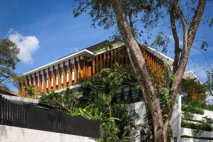 Namly View House is located in an exclusive neighbourhood of Singapore. The site sits on high ground flanked by large trees and surrounded by with a low roof line. The steep topography of the site allows a full basement that opens directly to the public road. The project takes the form of a raised plateau with multiple terraces that surround the site.