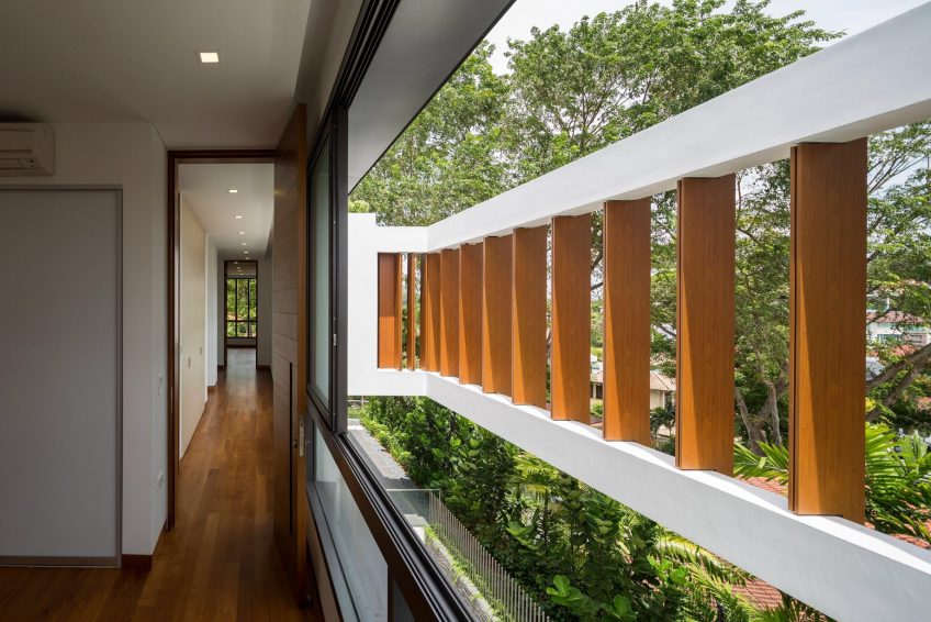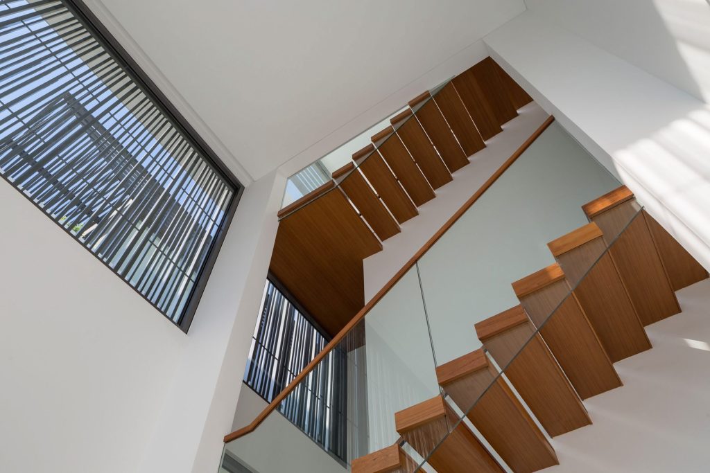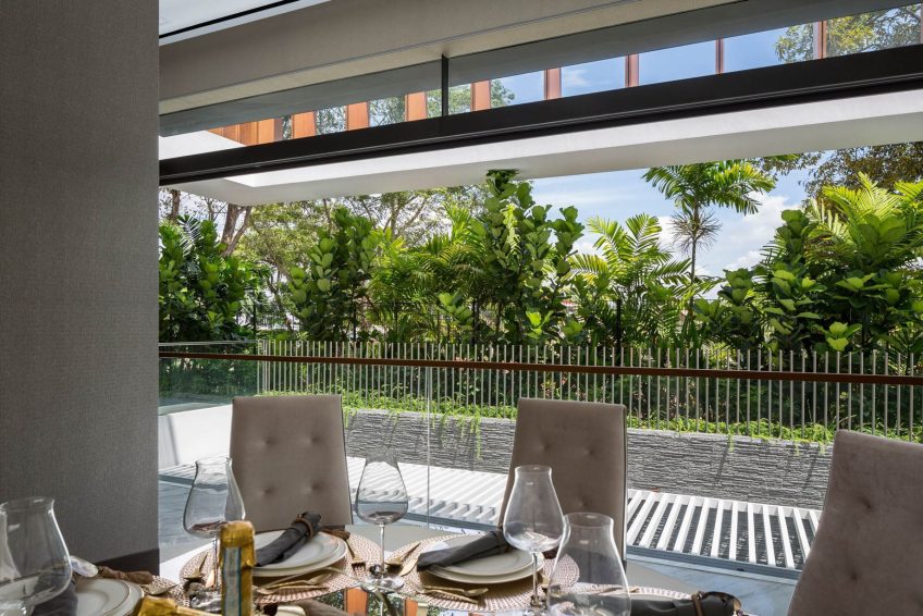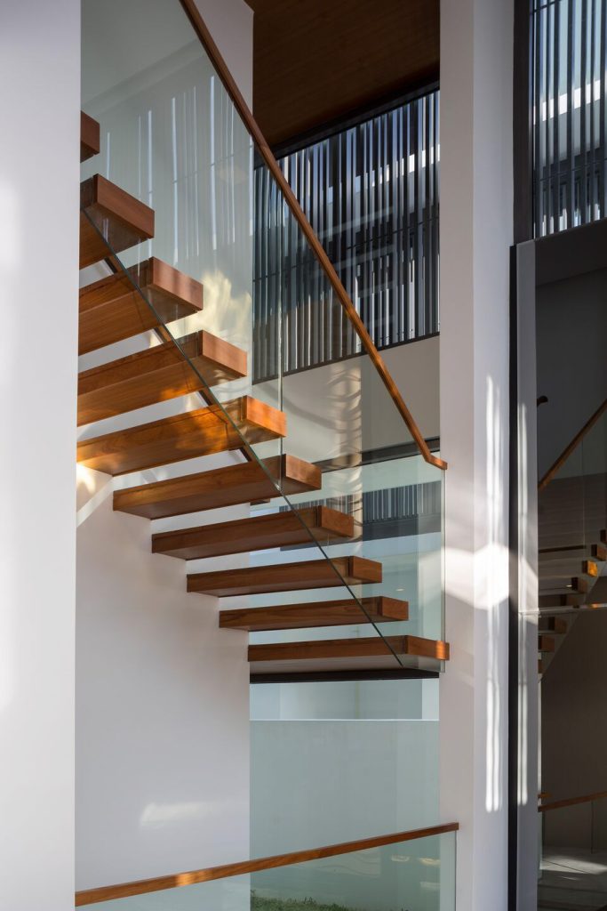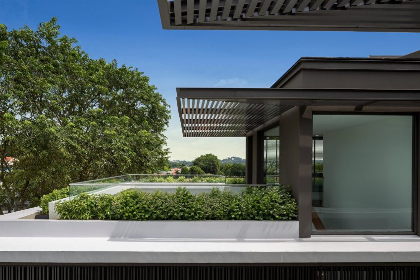 The top floor is an accessible roof garden and deck that offers vistas of the neighbourhood. Namly View House is designed with these in mind; a series of spaces that embrace the surrounding raintrees, using time-tested, passive-cooling design strategies. The result is an incredible expression of a luxury tropical house.
