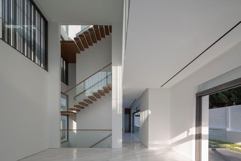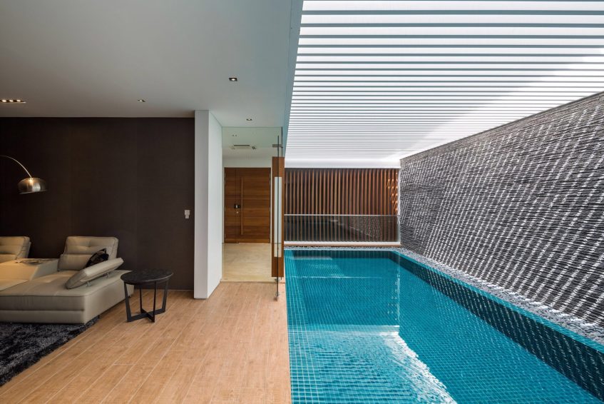 To maintain privacy, the houses are positioned near the centre of the lot to create a buffer between it and other adjoining conditions such as the road and the neighbouring other houses. Occupants and guests drive straight into the underground entrance and are welcomed by a sunken swimming pool that that illumines a vast space.