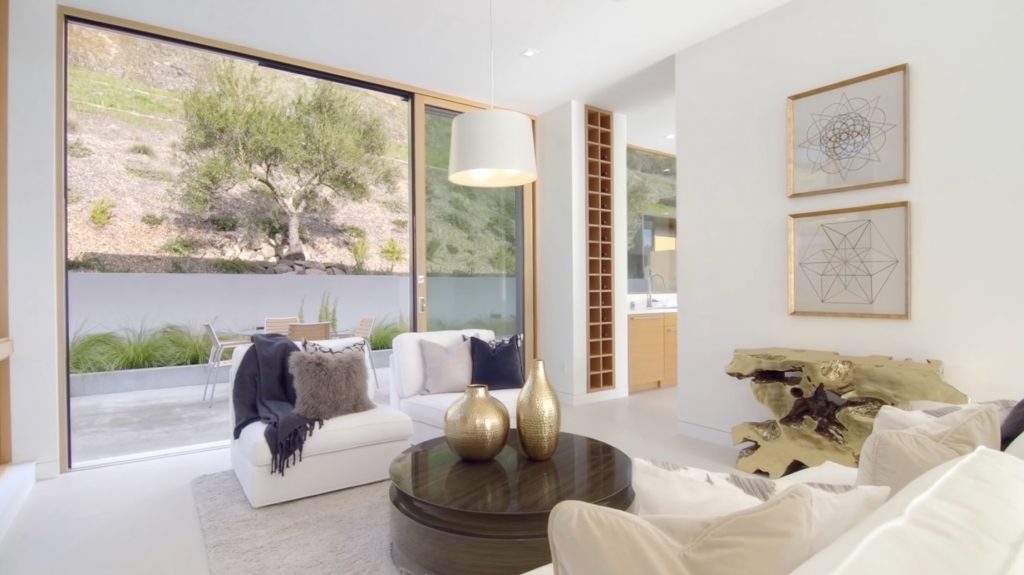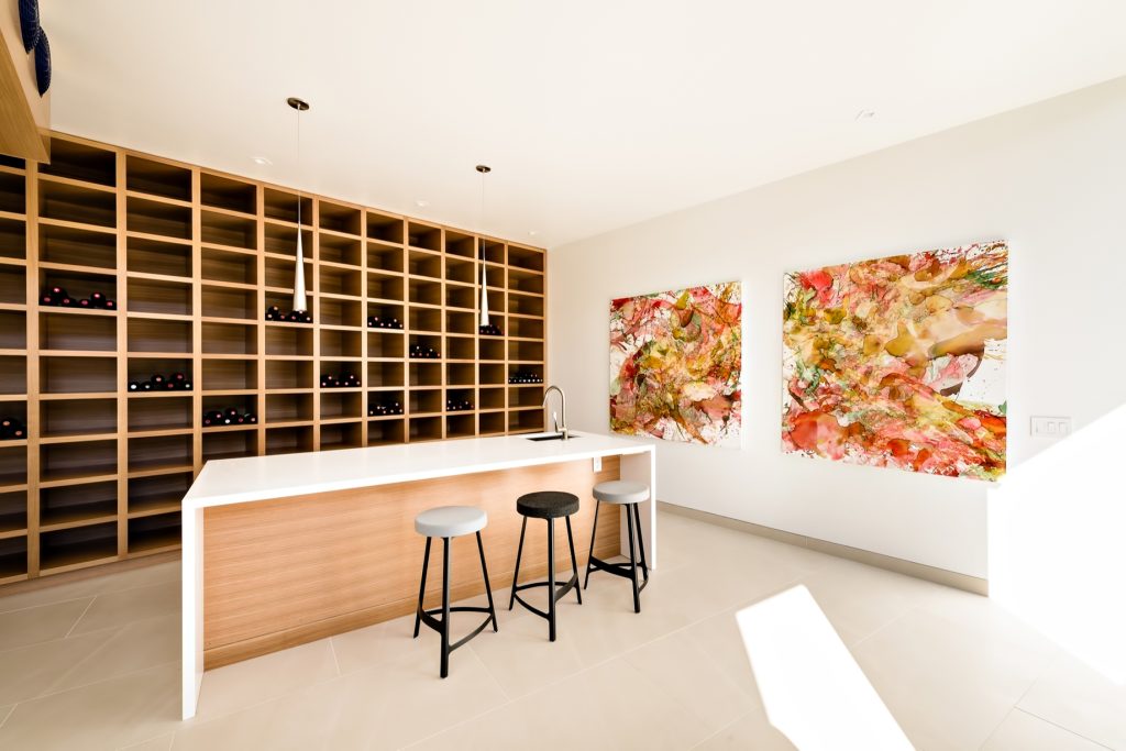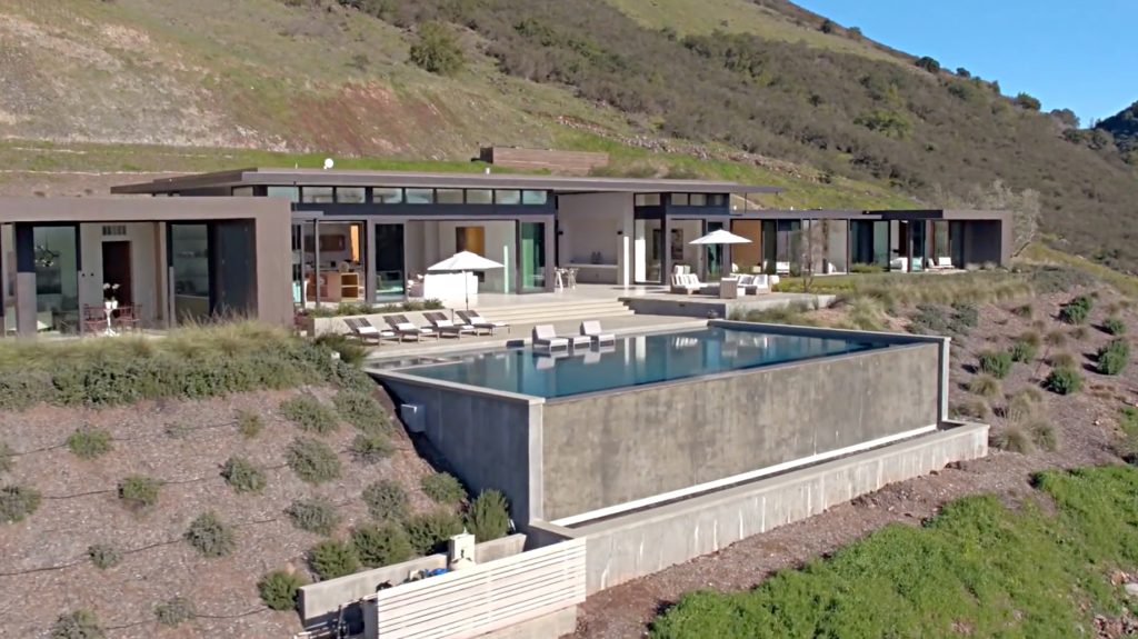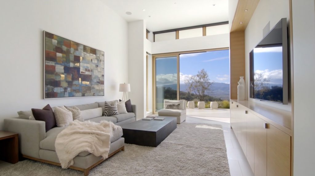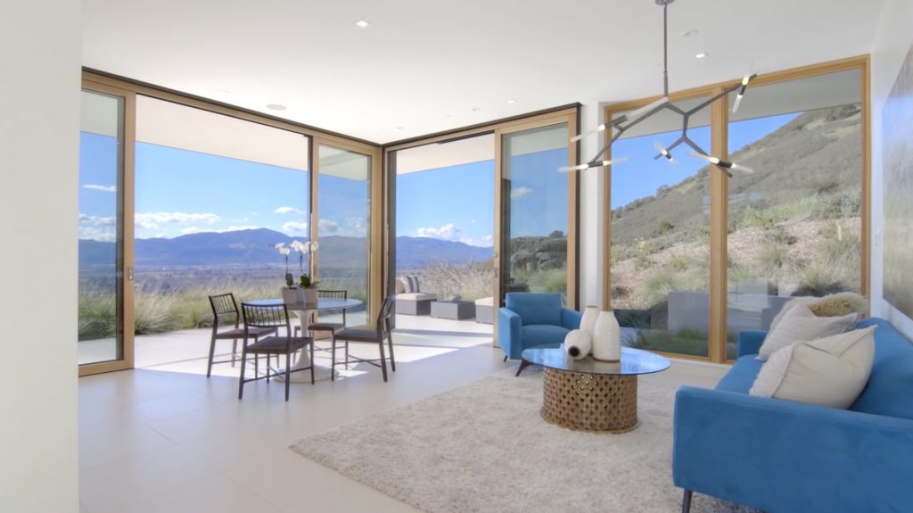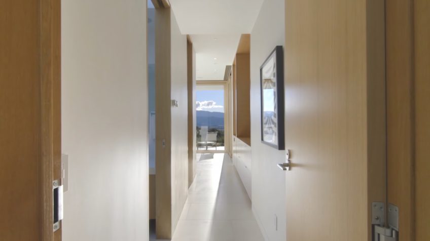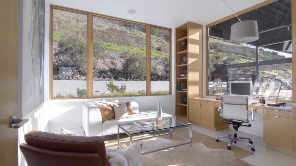The main house features an elegant courtyard water feature, four bedrooms, four and a half baths, a great room with fireplace, dining and family rooms, a surround sound home theater, office, an infinity edge pool, and a 2000-bottle wine cave carved directly into the hillside. The master suite houses an indulgent steam shower and soaking tub. Centralized controls make simple work of adjusting lighting, music, temperature, security and automatic louvers and shades throughout the home. Additional Green features include an electric car charging station, solar array, reverse-osmotic water filtration, central air conditioning and radiant heating.