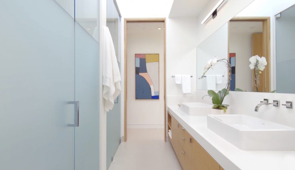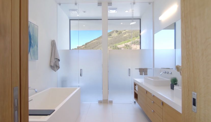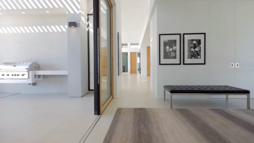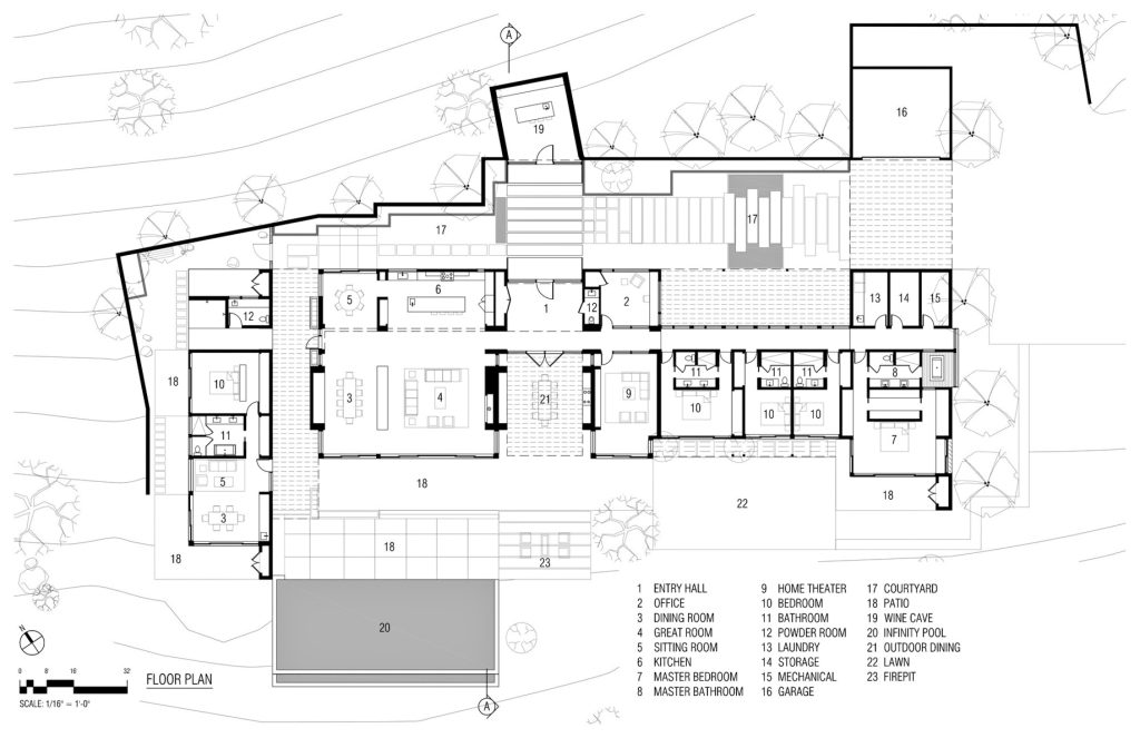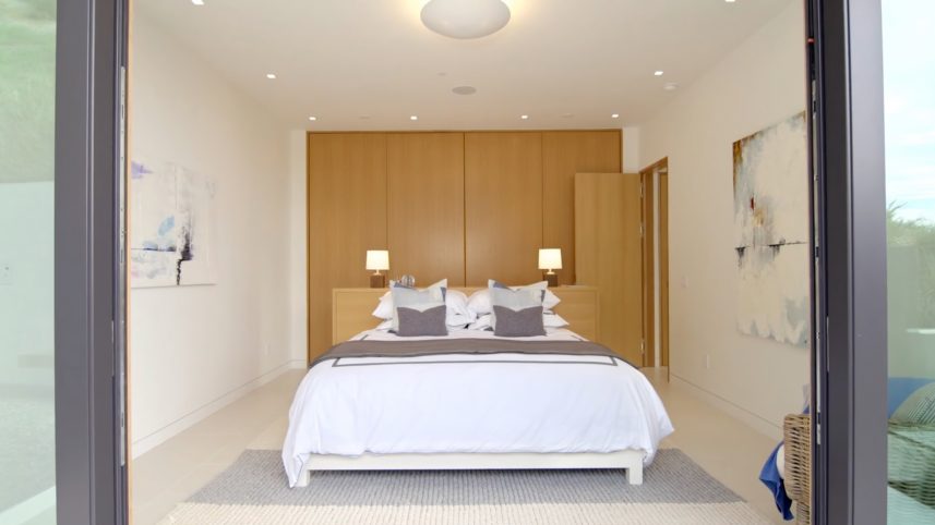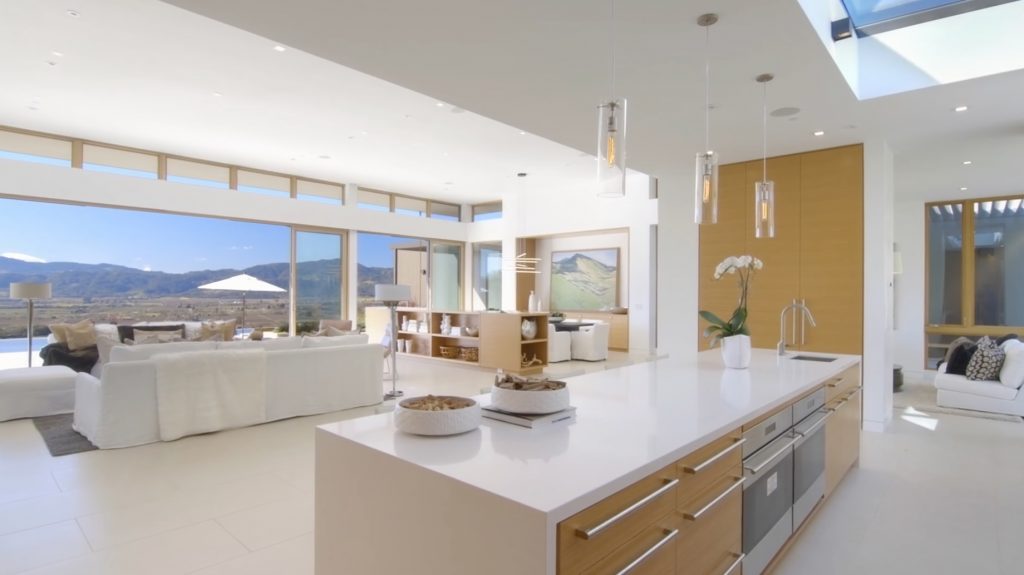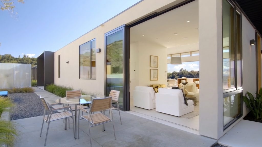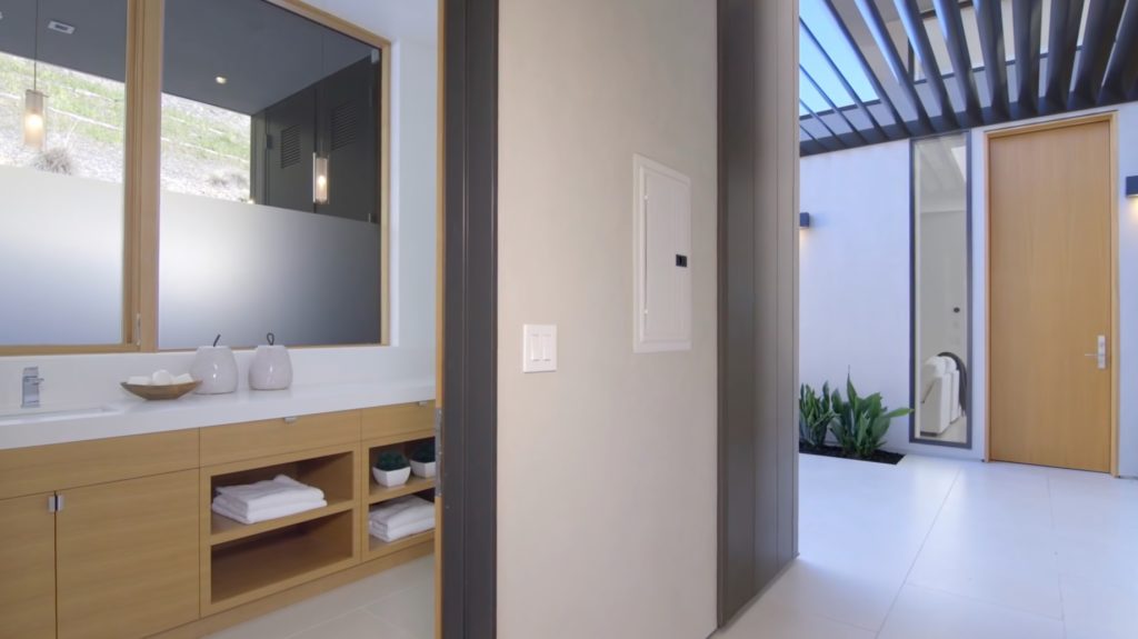 The main house features an elegant courtyard water feature, four bedrooms, four and a half baths, a great room with fireplace, dining and family rooms, a surround sound home theater, office, an infinity edge pool, and a 2000-bottle wine cave carved directly into the hillside. The master suite houses an indulgent steam shower and soaking tub. Centralized controls make simple work of adjusting lighting, music, temperature, security and automatic louvers and shades throughout the home. Additional Green features include an electric car charging station, solar array, reverse-osmotic water filtration, central air conditioning and radiant heating.