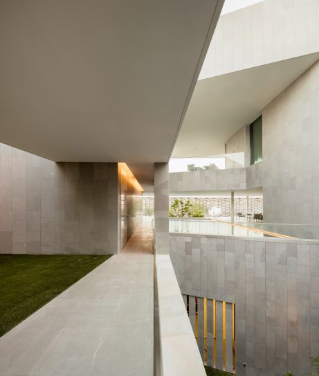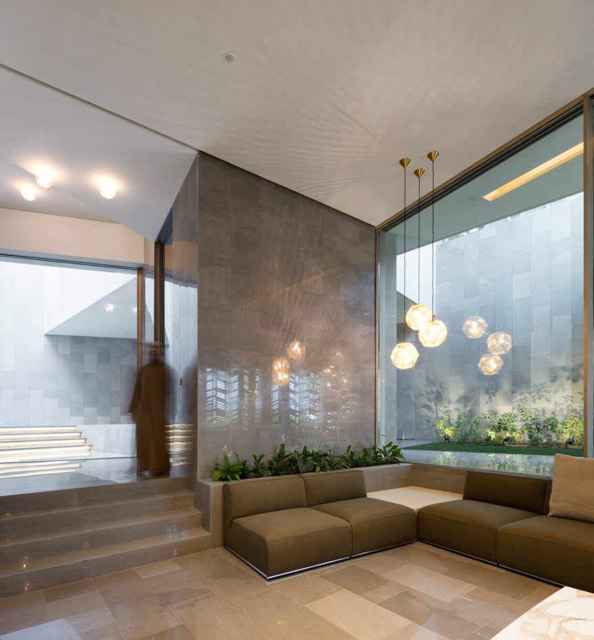 The public floor of Nirvana Home, dedicated to social gatherings, is a testament to Middle Eastern traditions of family and privacy. This level features interconnected courtyards designed to foster social interactions while maintaining privacy. The contrast between the grey polished marble geometric voids and the white rough ceramic exterior creates a visual duality reminiscent of a marble quarry, blending polished modernity with natural ruggedness. The architects incorporated climate-responsive features such as permanent shading, water elements, and natural soil to ensure these open spaces remain functional in Kuwait’s hot, humid environment.