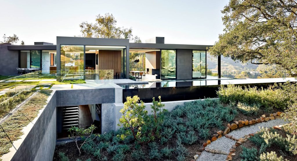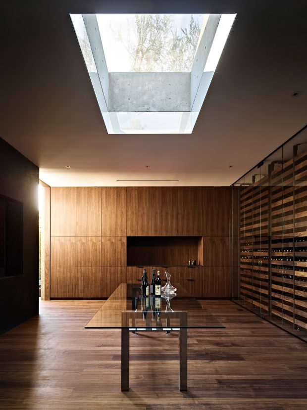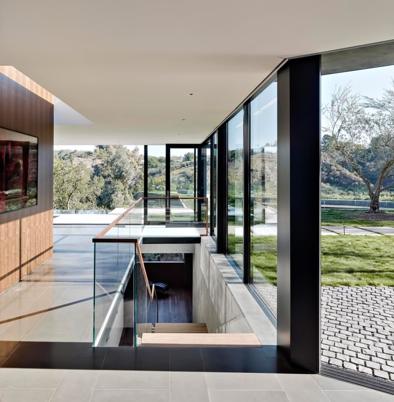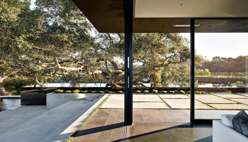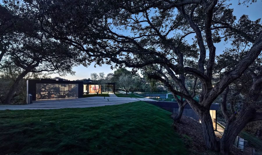This main house is ideal for the art collector with its gallery and abundance of art walls. The living and dining room is enveloped by floor to ceiling sliding doors overlooking the 75-foot raised infinity pool that cascades into the primary pool. The chefโs kitchen features a disappearing wall of glass that brings the outsideย in and a true wood-burning oven. The family room features a 920-bottle wine wall. All the bedrooms are isolated from the living areas. The master suite is its own reprieve surrounded by oaks and appointed with a private study and a sun-drenched spa bathroom. Additional amenities include a gym, steam and dry sauna, screening room, caretaker’s apartment, a music room that seats 80 people for performances and a 2-bedroom second residence that is an architectural triumph in its own right.