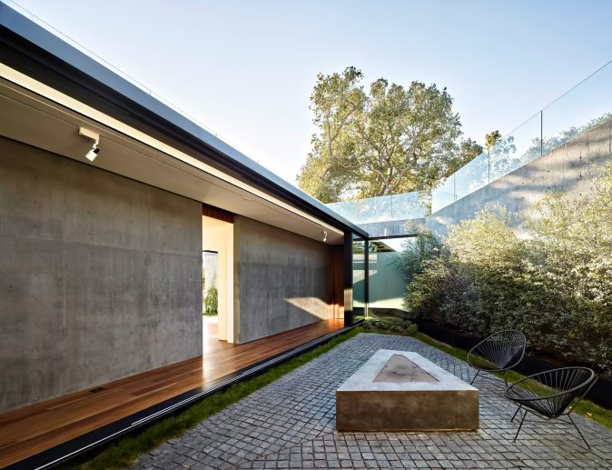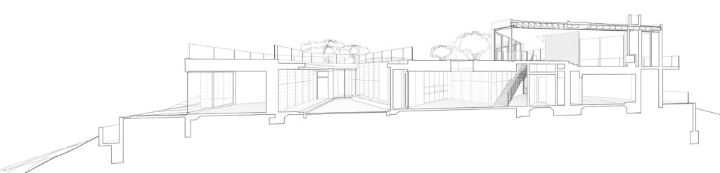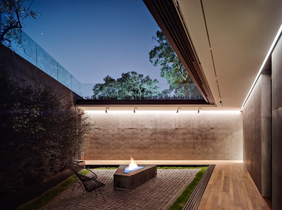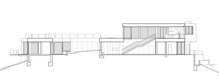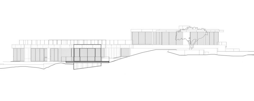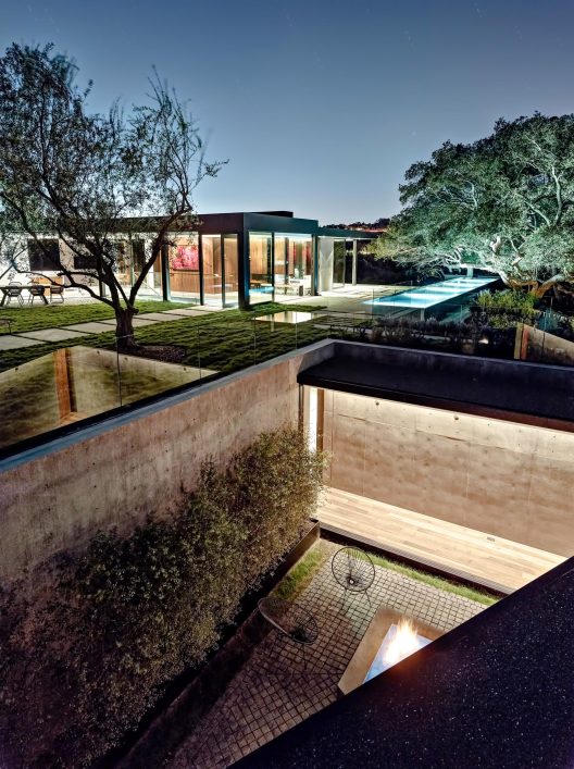 The structural massing was reduced by utilizing an upside-down program with the public spaces located above the bedrooms, which are buried into the hill and protected beneath a vegetated roof. A lower level courtyard allows light and air to flow to the buried hallway of the bedroom level. A seventy-five-foot lap pool with infinity edges on three of four sides bisects the house and slips beneath one of the largest trees on the property. The house is primarily constructed of structural concrete allowing for long, column free spans.