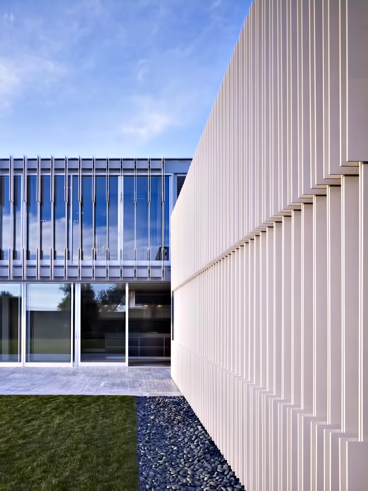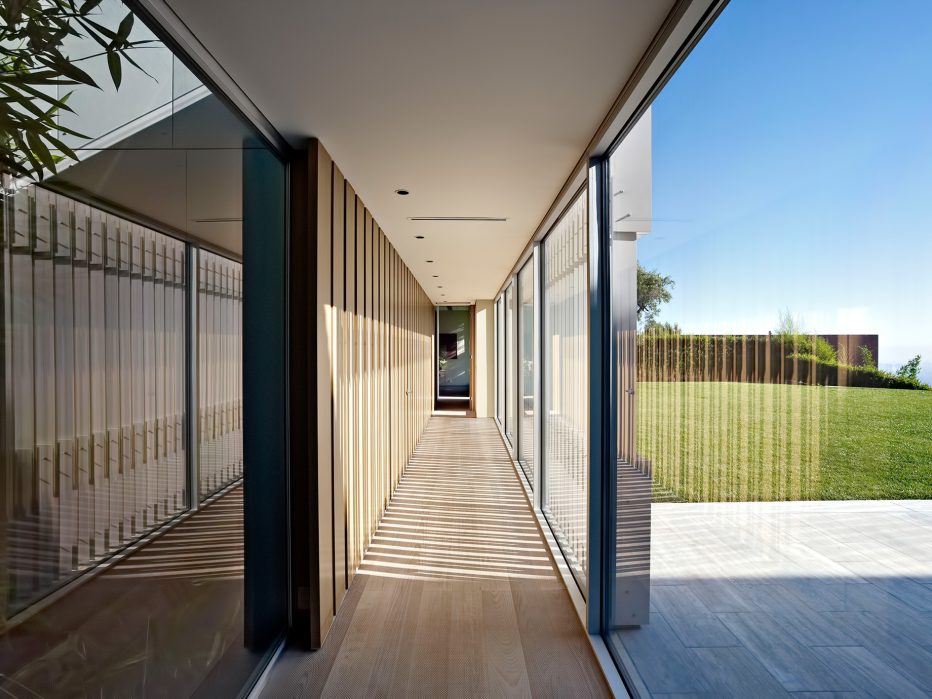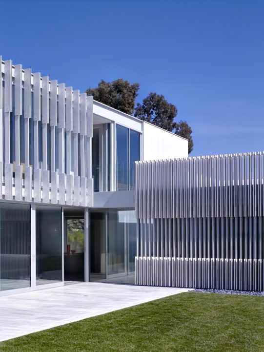 Cut into the hillside with large concrete retaining walls that are expressed through the interior of the residence, the home emerges from the basement with two additional levels of shiny white luxury. The custom homes 24’ wide and 200’ long L-shaped structure includes a main level that includes the kitchen, living and dining areas. The second level houses the bedrooms and private master suite. There are intentionally no deep spaces within the structure so that light floods in from all sides giving the home quite a beautiful feeling of openness.