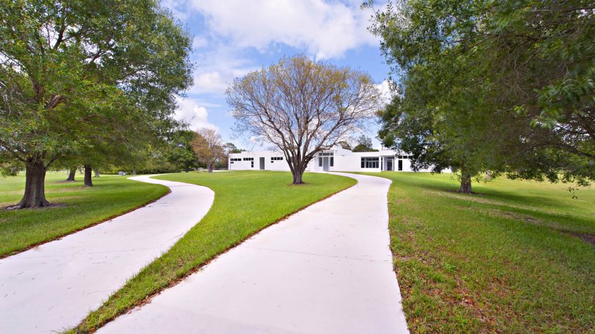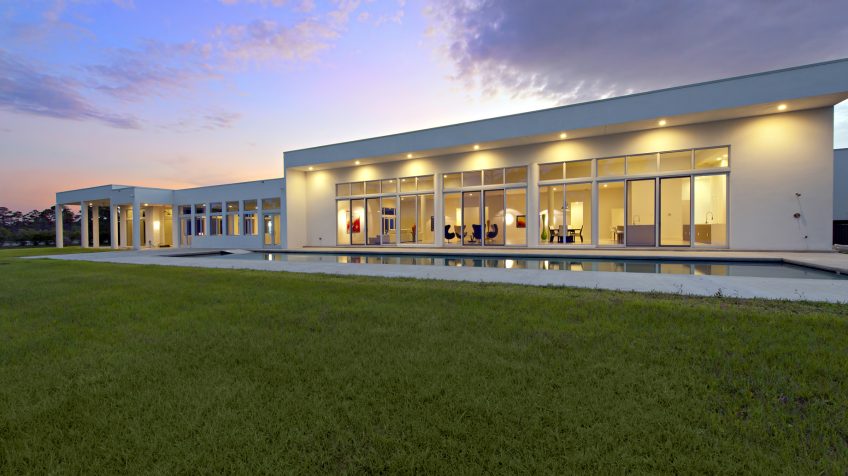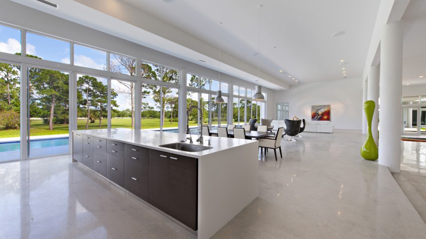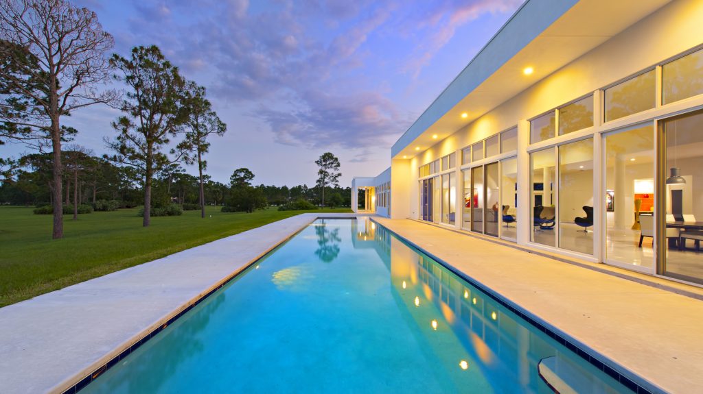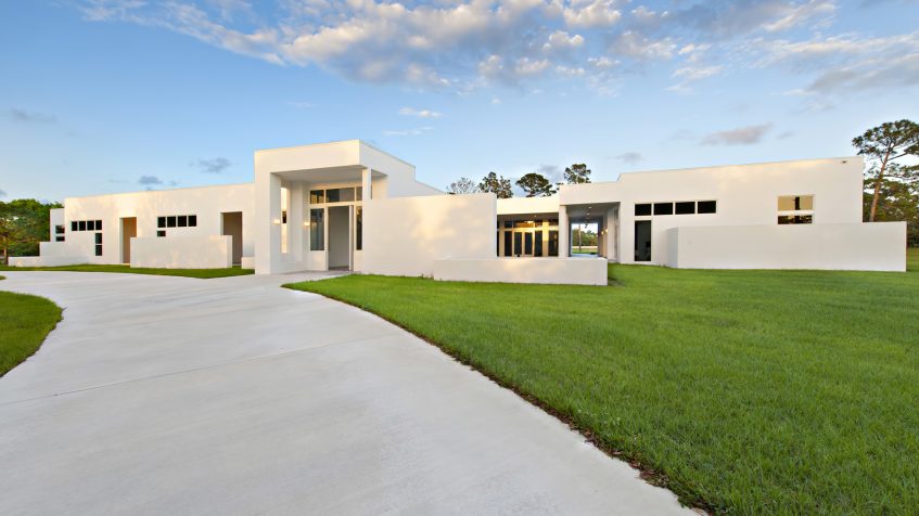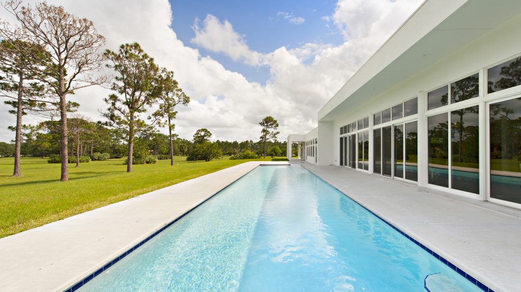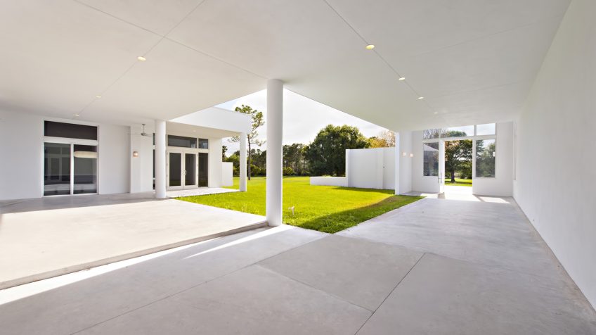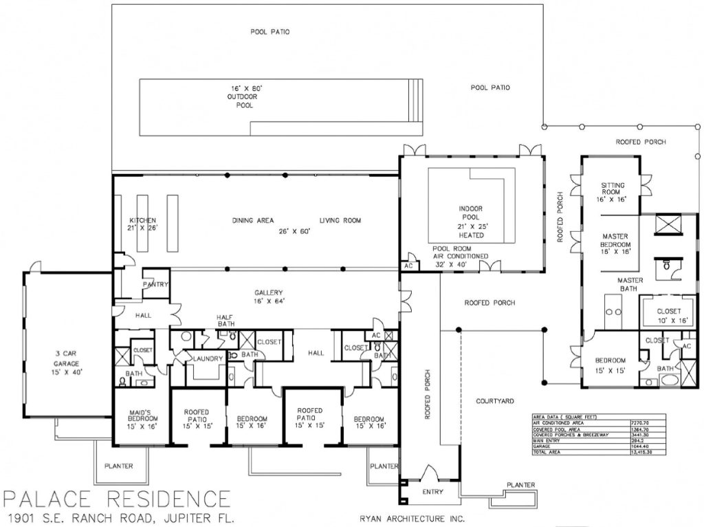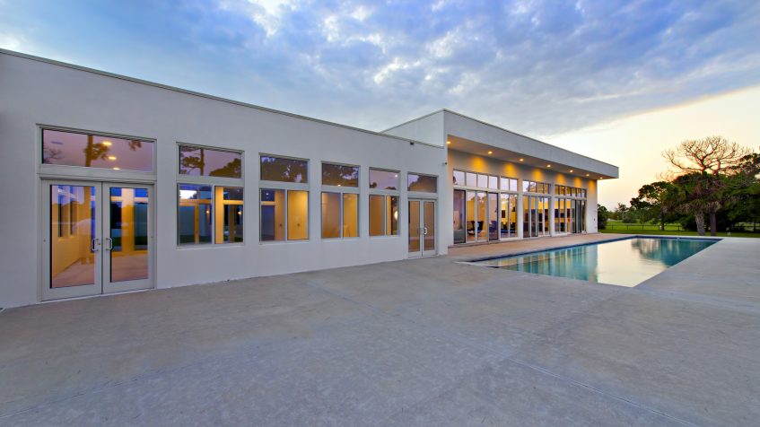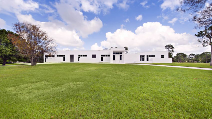 Situated on 20 private acres within the Ranch Estates section of the Ranch Colony development in Jupiter, Florida, the Palace Residence was inspired by the designs of Mies van der Rohe, with a characteristically modern design encompassing large bright open spaces and soaring ceiling.