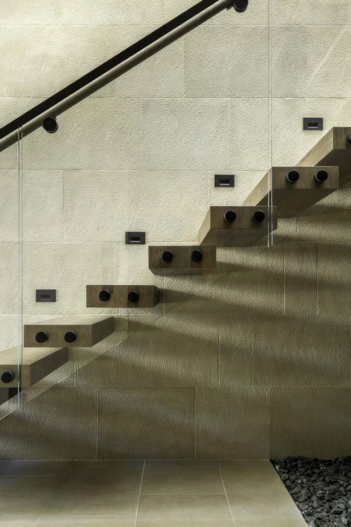 The homeโs L-shaped layout optimizes its connection to the environment, featuring expansive glazing that frames the stunning vistas while concealing a private courtyard with a pool, spa, and outdoor living spaces. Inside, the design is a harmonious blend of past and present, using natural materials like Japanese plaster, limestone, and stained white oak to create a tranquil atmosphere. Highlights include a professional-grade recording studio and a concealed speakeasy lounge, nodding to the homeโs mid-century roots while offering modern functionality. Timber plays a central role, with sustainably harvested Abodo Vulcan cladding by reSAWN TIMBER co. in dramatic black providing a durable, eco-conscious exterior that evolves gracefully over time.