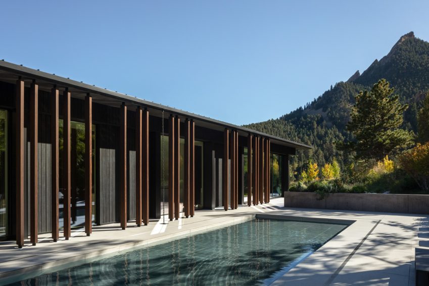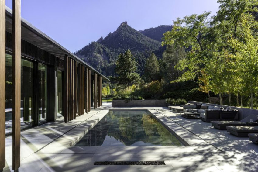 Panorama House stands as an exquisitely renovated mid-century modern residence designed by Studio B Architecture + Interiors in collaboration with Leap Interior Design. Originally crafted by famed mid-century architect James Hunter and recognized as a Historic Landmark, the home pays homage to its architectural roots while embracing modern design and sustainability. Offering sweeping views of the iconic Flatirons, the property seamlessly integrates into the natural topography, reflecting the homeownersโ vision of blending heritage, landscape, and contemporary luxury. The L-shaped design allows the home to embrace its surroundings while providing privacy with a hidden pool courtyard featuring a spa, outdoor dining, and lounge areas. Large-scale window glazing and a minimalist form frame panoramic vistas of Chautauqua Park, Boulder City, and the Front Range, creating a dialogue between indoor and outdoor spaces.