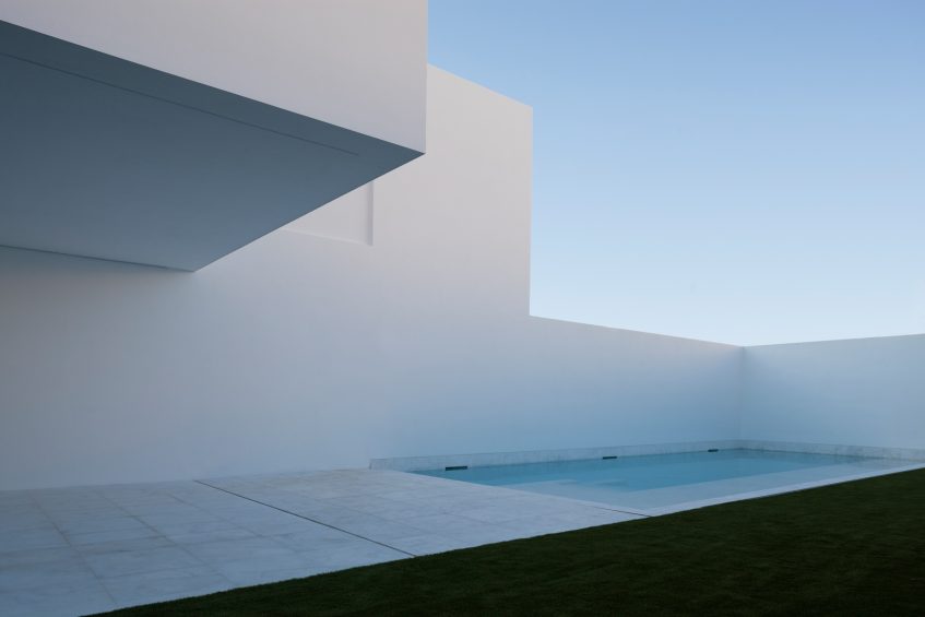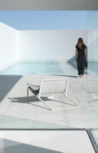 Incorporating the serene interplay of green grass, blue water, and the vast sky, the Pati Blau House frames these elements within its expansive white walls, presenting a visual symphony that enhances its surroundings. This design not only maintains a visual connection with its environment but also enriches the occupants’ experience by bringing in colors and light through large openings aimed at the lush garden and reflective pool, effectively harmonizing modern architectural principles with the intrinsic qualities of traditional local dwellings while offering its residents a sanctuary that seamlessly integrates modern comfort with timeless architectural allure.