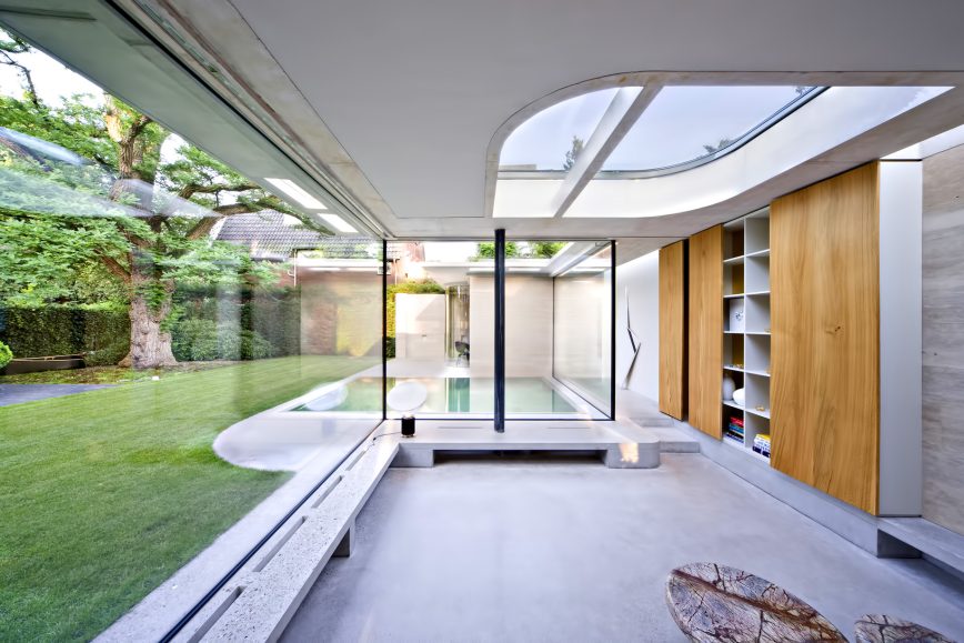 This modern contemporary transparent extension to a traditional Dutch house, is a stunning Pavillion structure that was added with angular geometry interrupted by curved and wavy wall surfaces which give an organic, dynamic character to the space.
