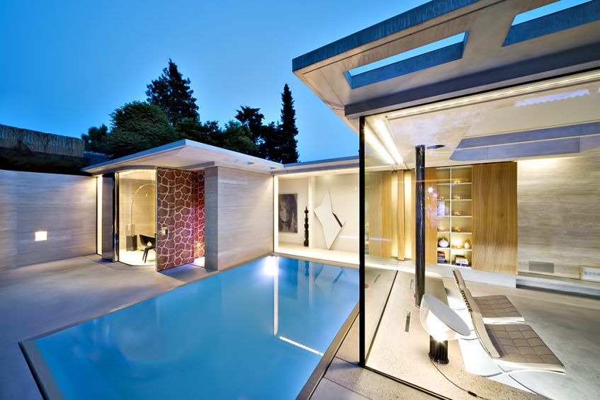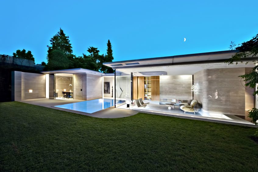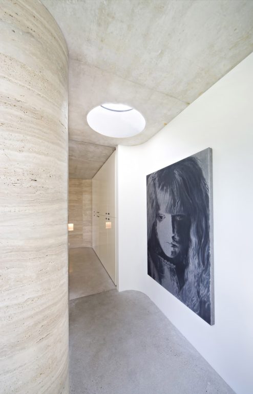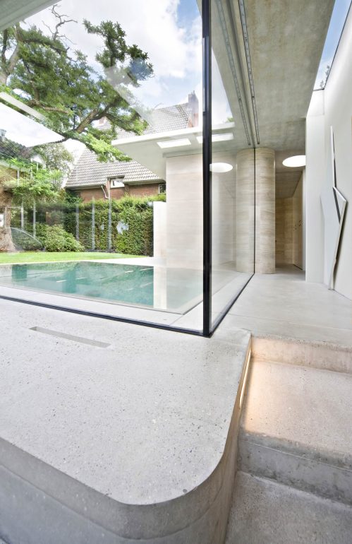 Much attention is paid to careful detailing. Positioning of roof lights, curved walls, steps, niches which store the curtains, floor heating and cooling ceiling, acoustic panels and lighting are concealed and determine the appearance and character of the area, while adding an iconic architectural addition to the existing house.
