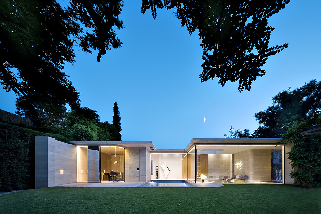 The open translucent addition to the house is a continuation of an earlier exterior expansion with thin floating concrete eaves. These overhangs give a balanced picture, allowing the spaces seamlessly to blend, and gives the garden an intimate enclosed character. The sightlines are important, creating separate spaces as a study niche, a lowered seating area with wide windowsills and a hanging fireplace. The roof connects the spaces seamlessly into each other.