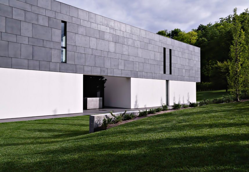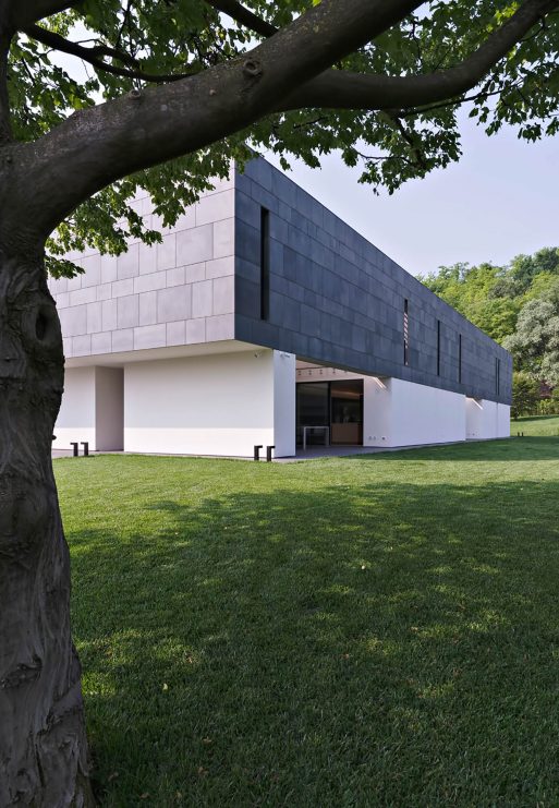 with concrete. The upper volume, with its grey stone slabs cladding rests on