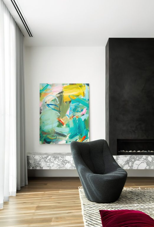 It is these junctions of stone and timber echoed with art throughout the house, which layers paired back textures and materiality. The smooth timber of the floors and white walls and stone in the interior contrast with the dark accent cabinetry, stair balustrade and epic dining table for big family meals. Full height slider doors and windows providing flexibility between indoor and outdoor spaces especially designed for this playful family.
