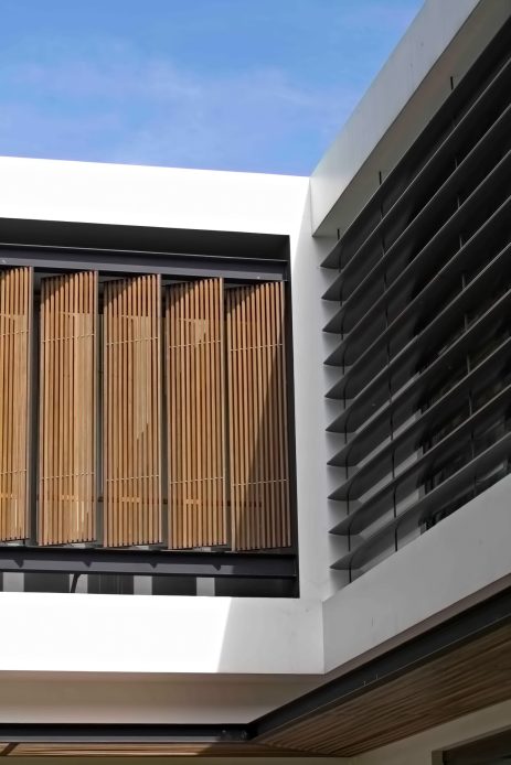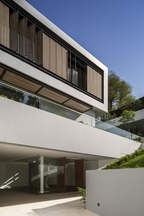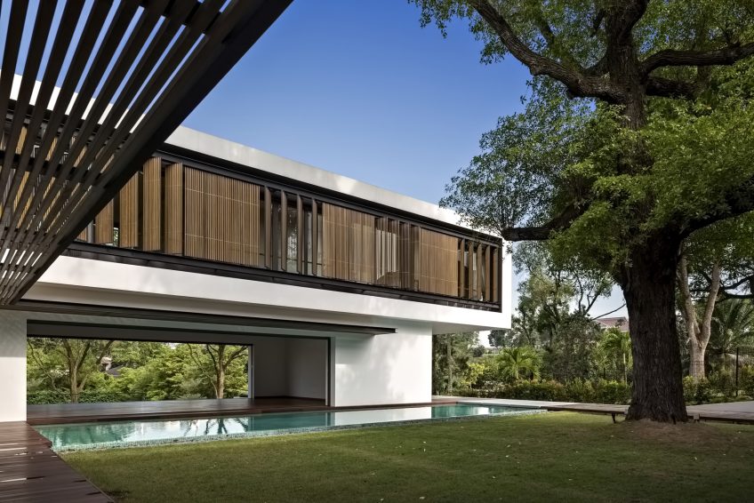 The adoption of white painted concrete walls, timber shuttered windows, and a geometrically simple and understated expression, underscores the desire to defer to the conserved colonial house sited directly across the See Through House, once the residence of a former president of Singapore. At the same time the simple geometries express and root the See Through House as a construct of this day and age. Hardwood sunscreen fins ribbon the facade, a reinterpretation of the tropical louvred window of the old colonial bungalow. It remains ever relevant, being that unassuming device that ably filters the harshness from the extremes of weather.