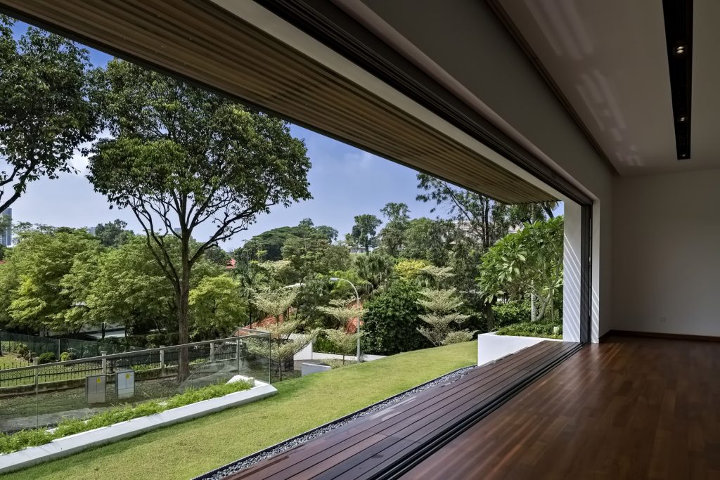 The See Through House is located in one of the most exclusive areas of Singapore and was conceived together as part of a larger project comprising seven other houses. The client had resided in the old house sited atop this large piece of land; it was decided to develop six additional houses that would surround the old house. The owner selected six architects to design six distinct new houses. The old house would undergo a make-over conducted by another architect. Wallflower Architecture + Design was commissioned to design the first house in the cluster of seven sub-divided plots. The old house sits on the highest point of the land and has a panoramic view of the city. In order to preserve the vistas, Wallflowerβs brief was to design a house no taller than the 2nd storey balcony of the old house.