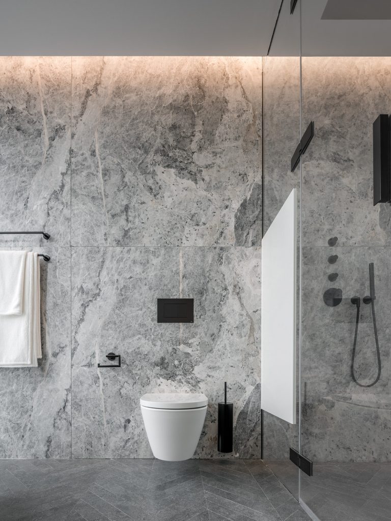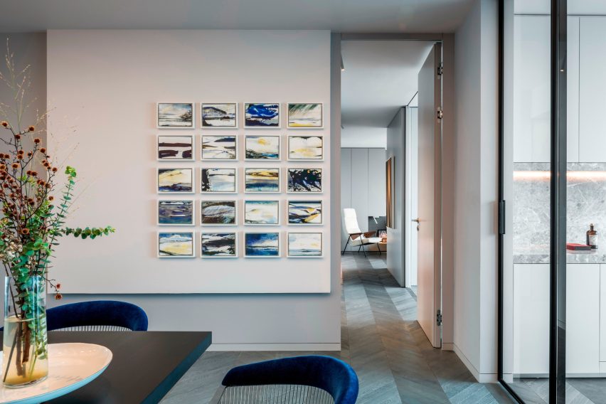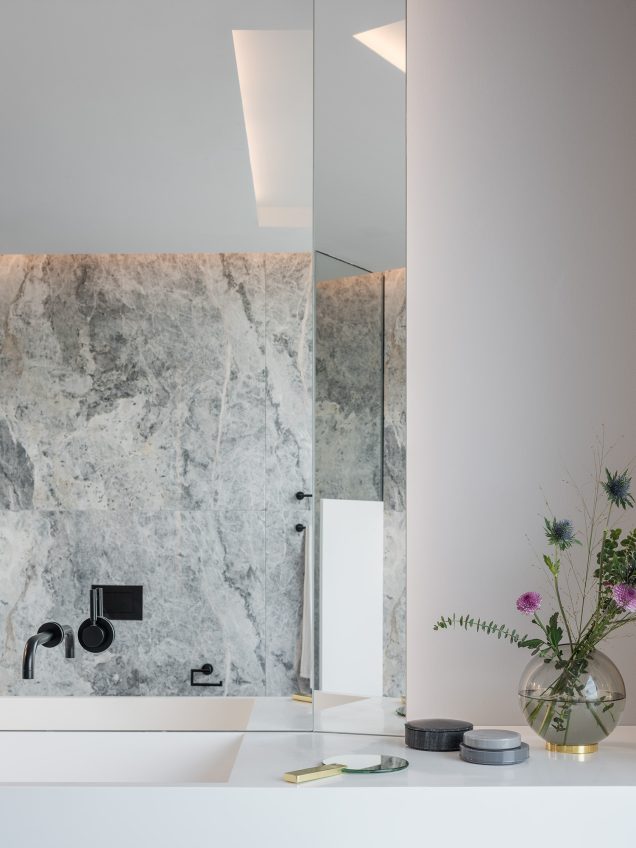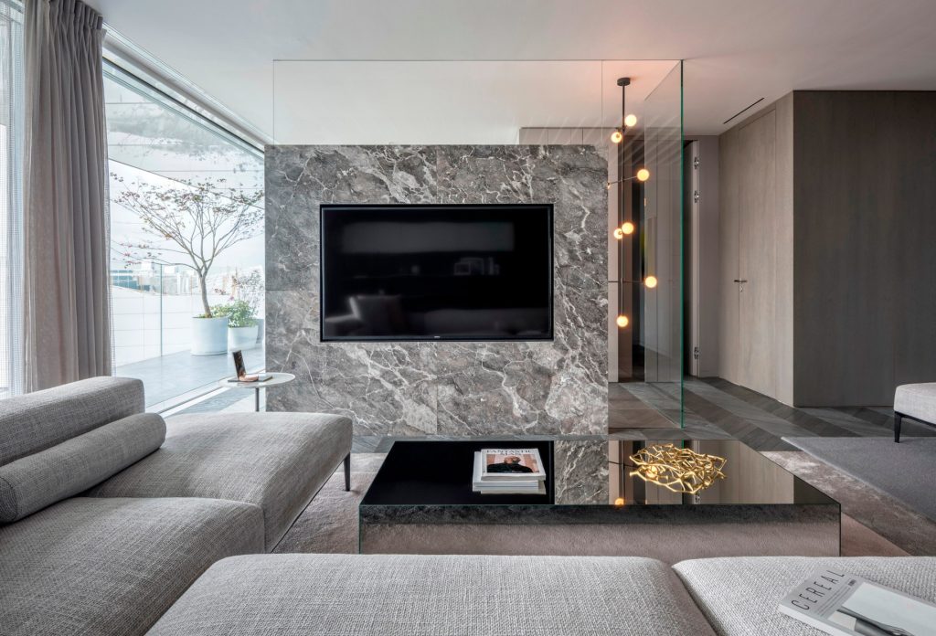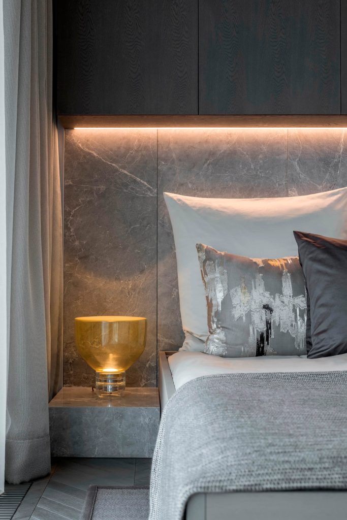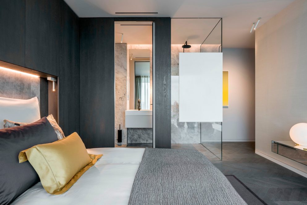 Herringbone-patterned parquet flooring in dark grey literally lays the foundation for the “Shades of Grey” theme, whereas contrasting hues of green and blue create highlights and support the apartment’s modern, elegant, and calm atmosphere. The contrasting, yet matching mix of materials creates an atmosphere of both calm intimacy and excitement in the living area. Materials with exciting haptic features and smooth marble and mirror-glass surfaces, while earth and gold-toned accessories provide an extra touch of luxury.