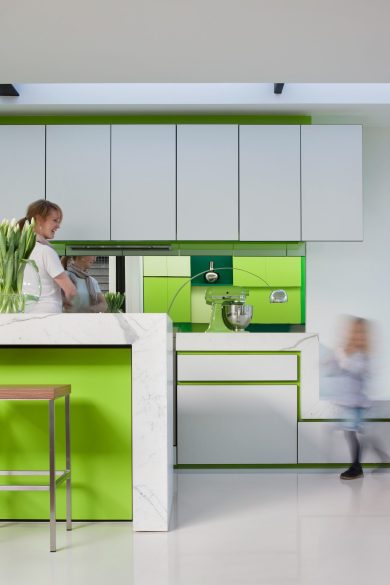 The client requested a predominantly white interior with a feature highlight colour. Green became an obvious choice, working in combination with the proximity of the garden. The green spaces within and beyond the site became the focus with the white cubes acting as lens for these events, effectively assisting in bringing the green inside and dissolving barriers of enclosure. In this way interior, exterior, landscape, all old and new, through colour, all inform each other with equal importance.