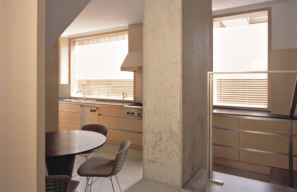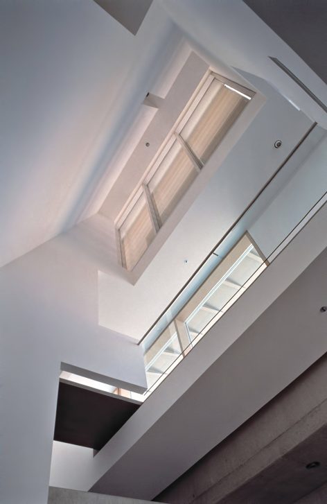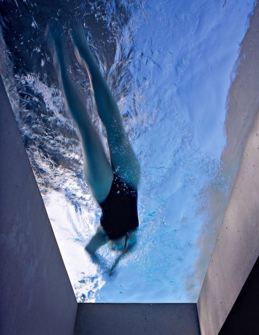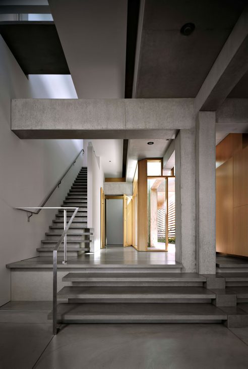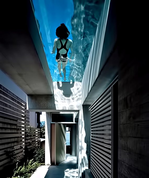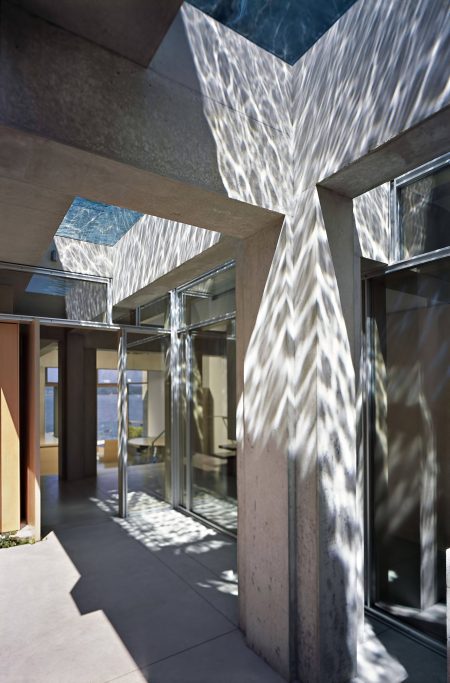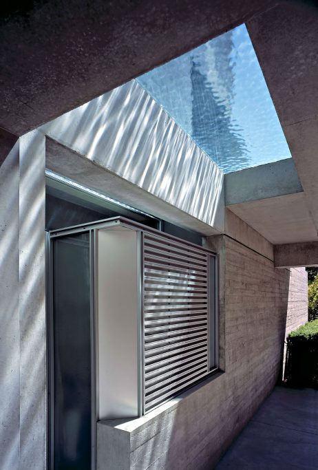 Generous ceiling heights enlarge spaces; a clerestory above the lap pool transmits daylight and dappled, reflected light deep into the central spaces, including the dining room, which rises from the ground level to the upper level of the house. The entrance is directly under the pool, midway along the side of the house. An almost magical aqueous light is transmitted to the entrance area through the water and glass bottom of the pool. The result is a home that is much more than the sum of its parts, it is a residence alive with a sublime interaction of light and water delineated by the linear poise of its geometric architecture.