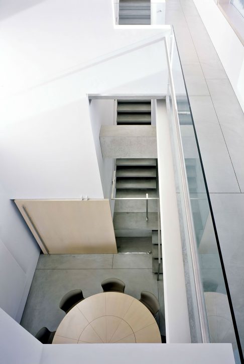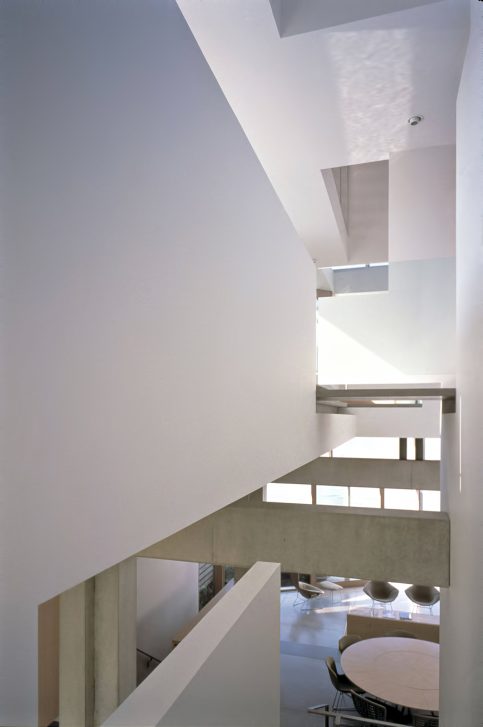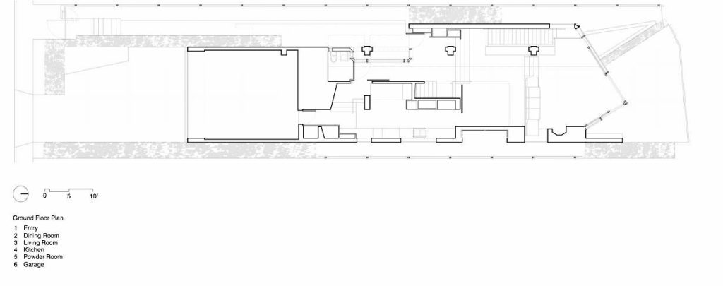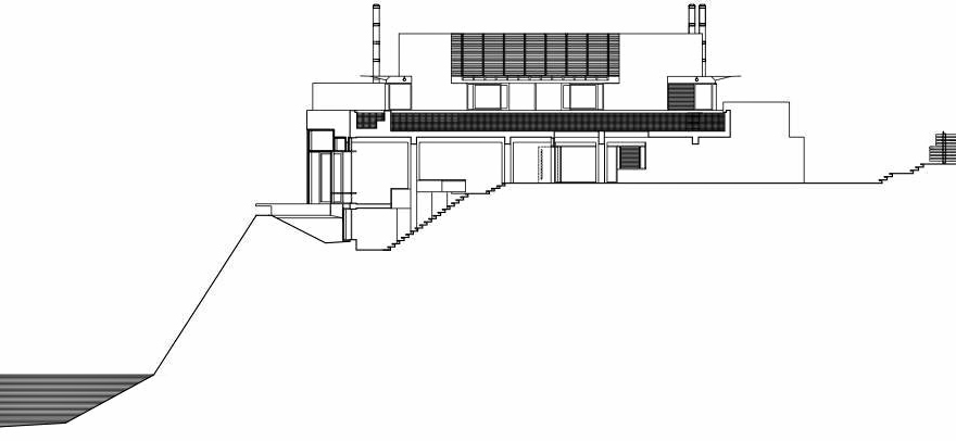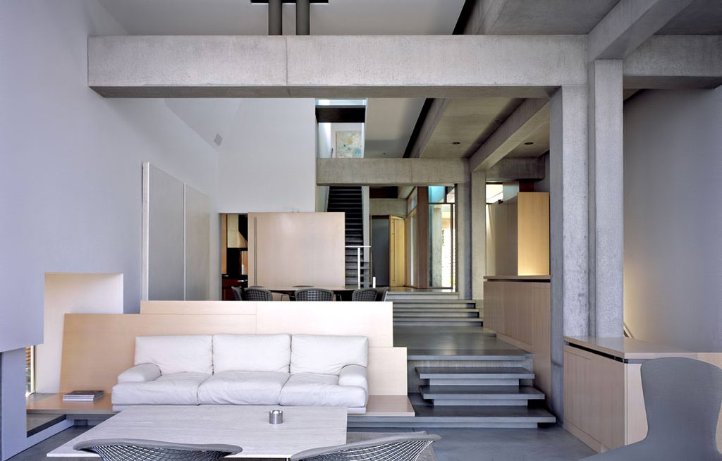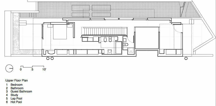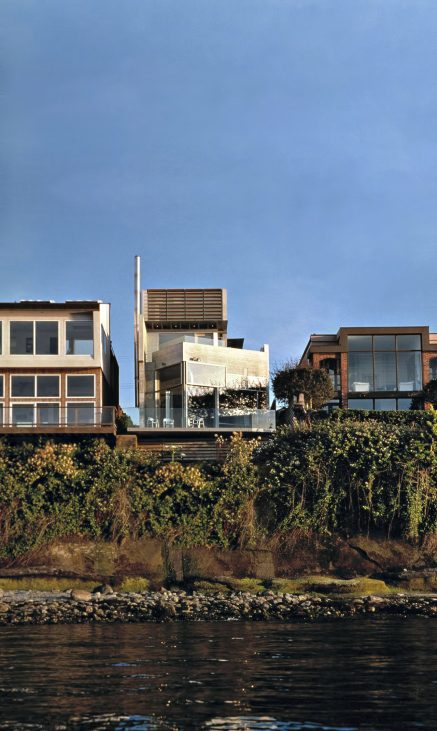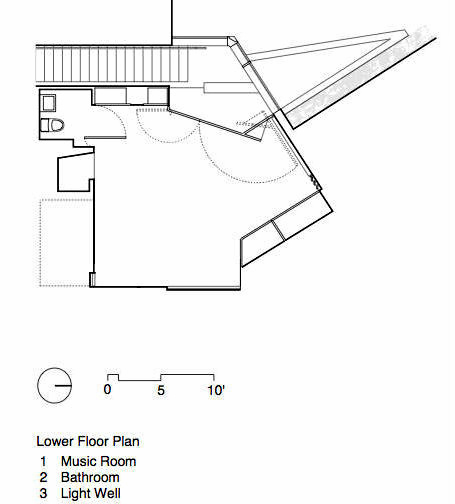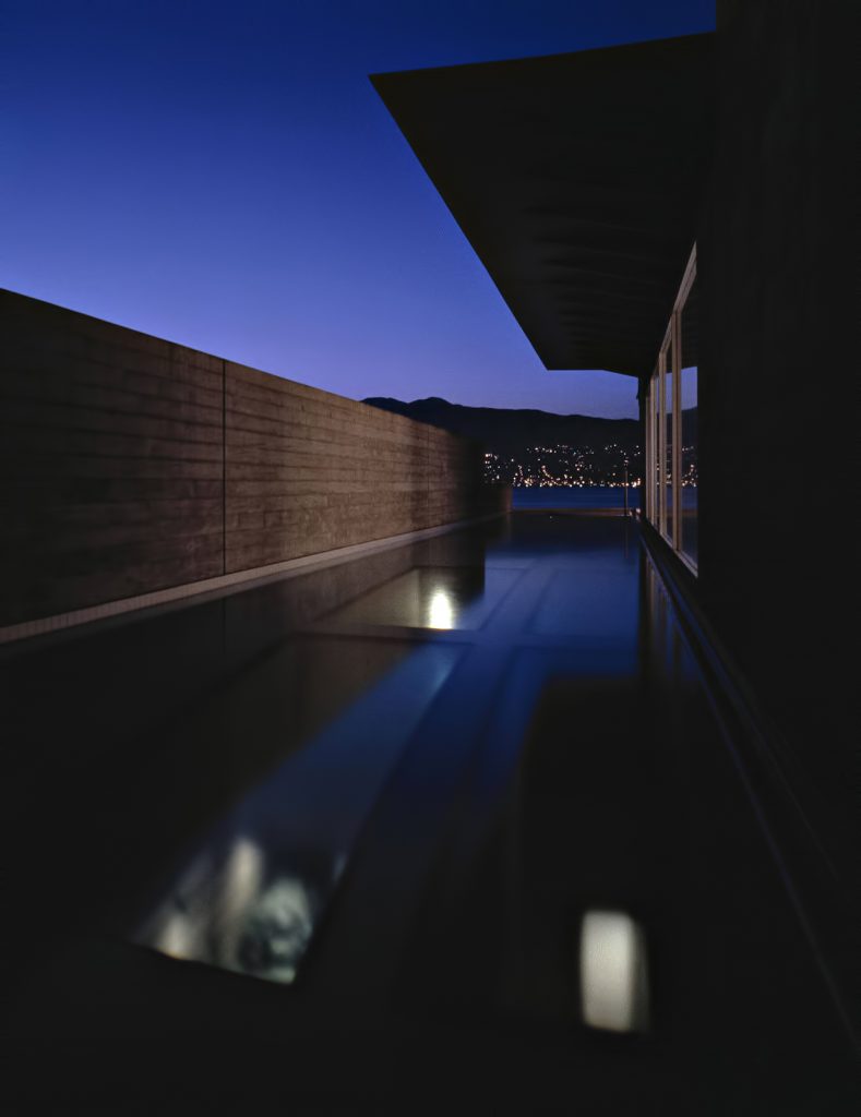 Constructed so that the spatial expansion of the residence is orientated outward over the water and upward, the house is organized with living spaces at grade, a music room below, and a single bedroom, study, and the lap pool above.