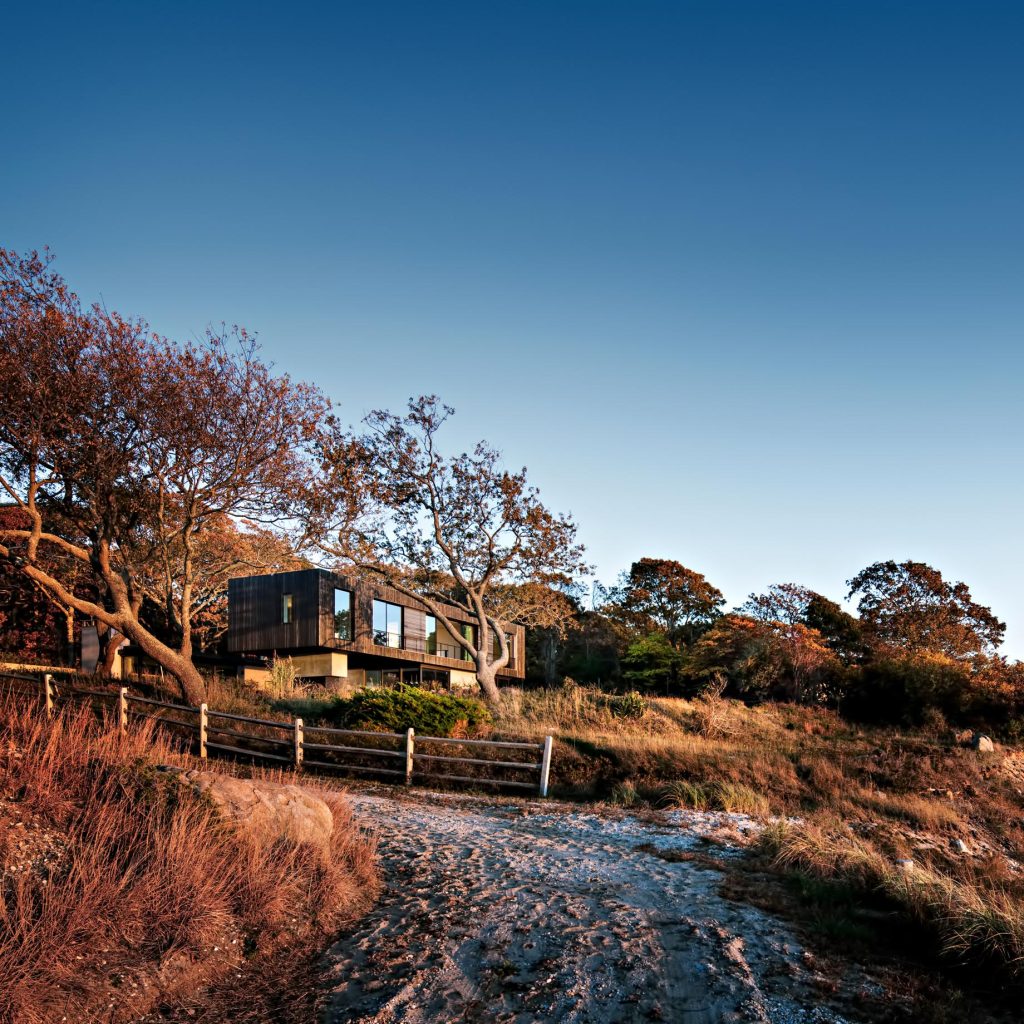 Designed by Leroy Street Studios of New York, the home was conceived of as a house that kind of disappears into the landscape and is a gateway for experiencing the passage from forest to sea. The approach was meant to guide the individual through a sequence of views revealing new perspectives of the house, sky, and water. A cut in the earth offers entry to the house, followed by a sequence of interior and exterior spaces that slowly open to sweeping views of the bay.