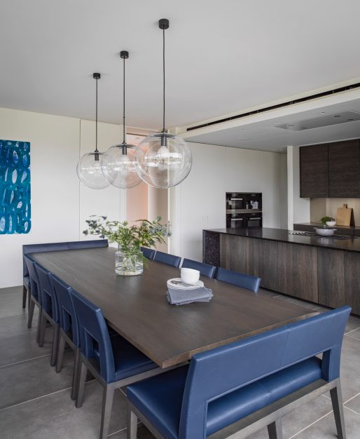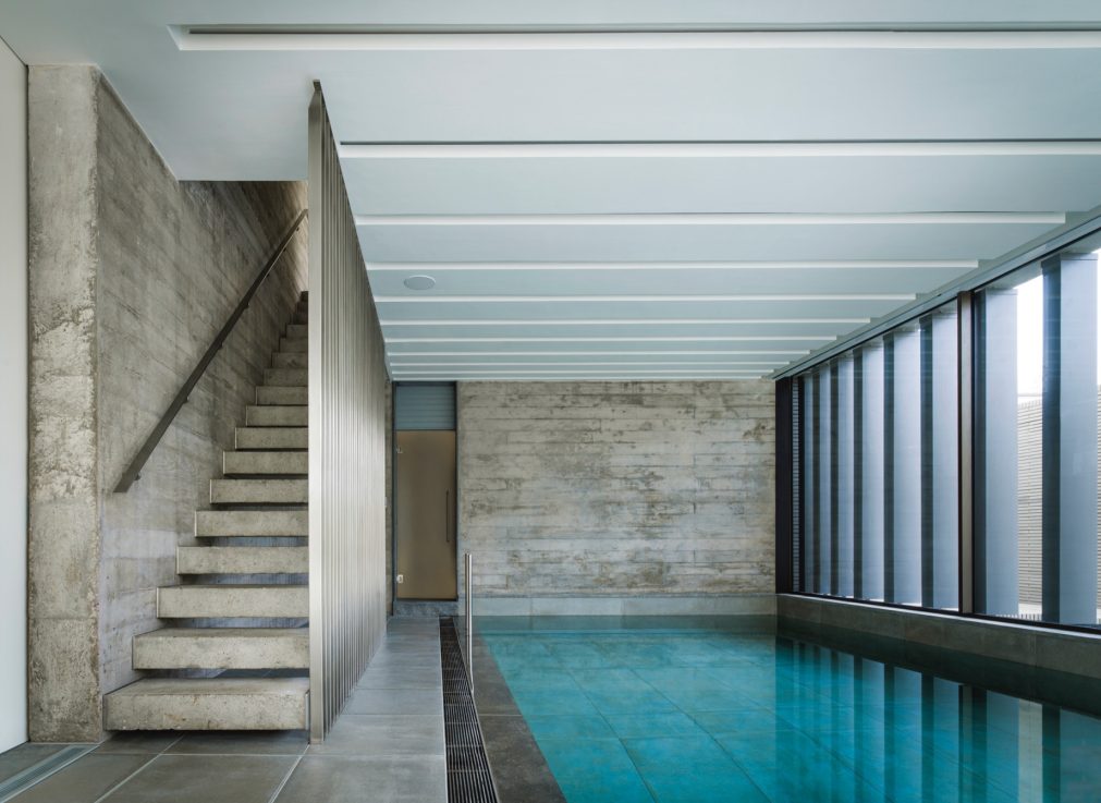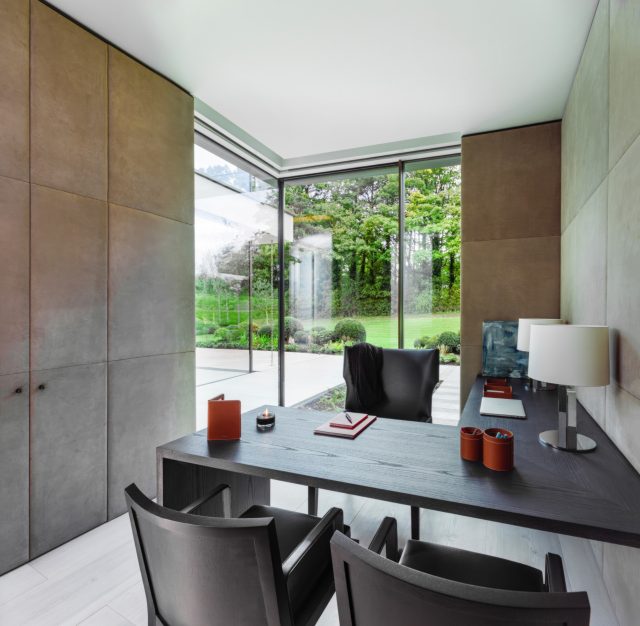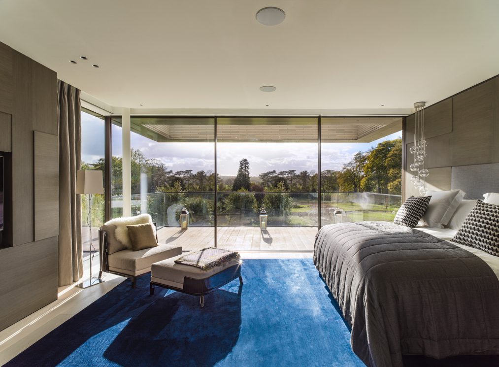 The entrance to the home, accessible via a covered walkway that spans a reflecting swimming pool, opens into a double-height hall that sets the tone for the residence’s sophisticated interior. Here, meticulously crafted spaces are adorned with custom finishes, joinery, and lighting, all contributing to an atmosphere of understated luxury. The design philosophy behind the residence is evident in every detail, from the monolithic garden walls that encircle the central courtyard to the generously proportioned balconies and openable window walls that dissolve the boundaries between the interior and the exterior. These architectural elements, reminiscent of the iconic Case Study Houses of mid-century California, contribute to a living experience that embodies a sense of relaxed elegance rarely achieved in contemporary British homes.