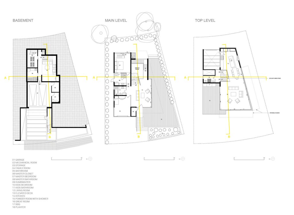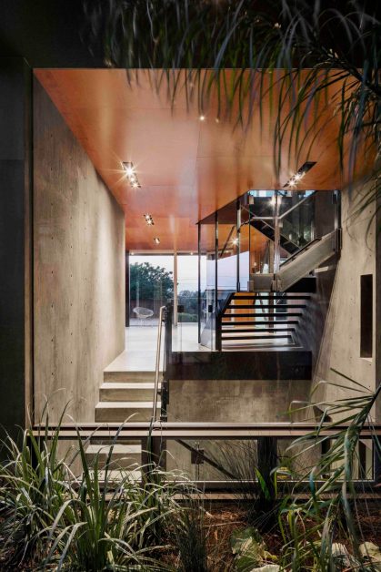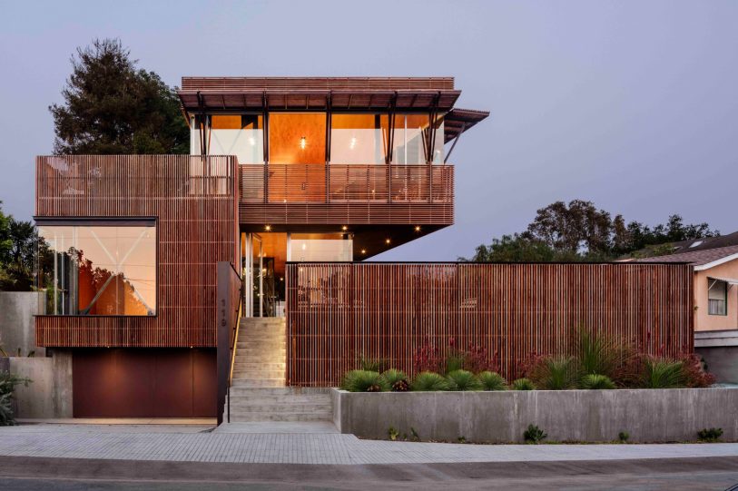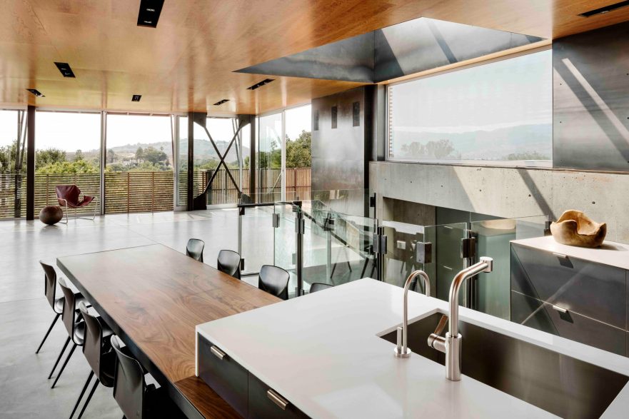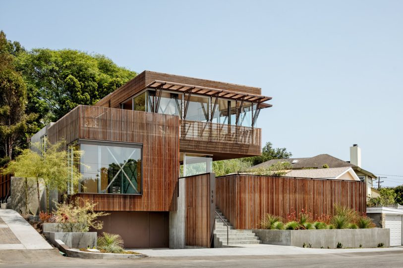 Skyline Residence, by ShubinDonaldson, reimagines coastal living through innovative design. The three-story home maximizes its challenging hillside site, zoning constraints, and Pacific Ocean vistas. The top floor houses open-plan living areas to capture panoramic south- and west-facing ocean views, while the second floor features private bedrooms and a lounge. Below, a partially submerged ground floor accommodates service spaces like a garage and laundry room. A central steel-and-concrete staircase, crowned by a skylight, connects all levels, flooding the interior with natural light. The home’s angular, cantilevered form, crafted from a restrained palette of wood, glass, steel, and board-formed concrete, responds to the site’s steep slope and strict building codes, creating a striking yet context-sensitive addition to the suburban neighborhood.