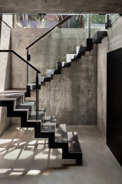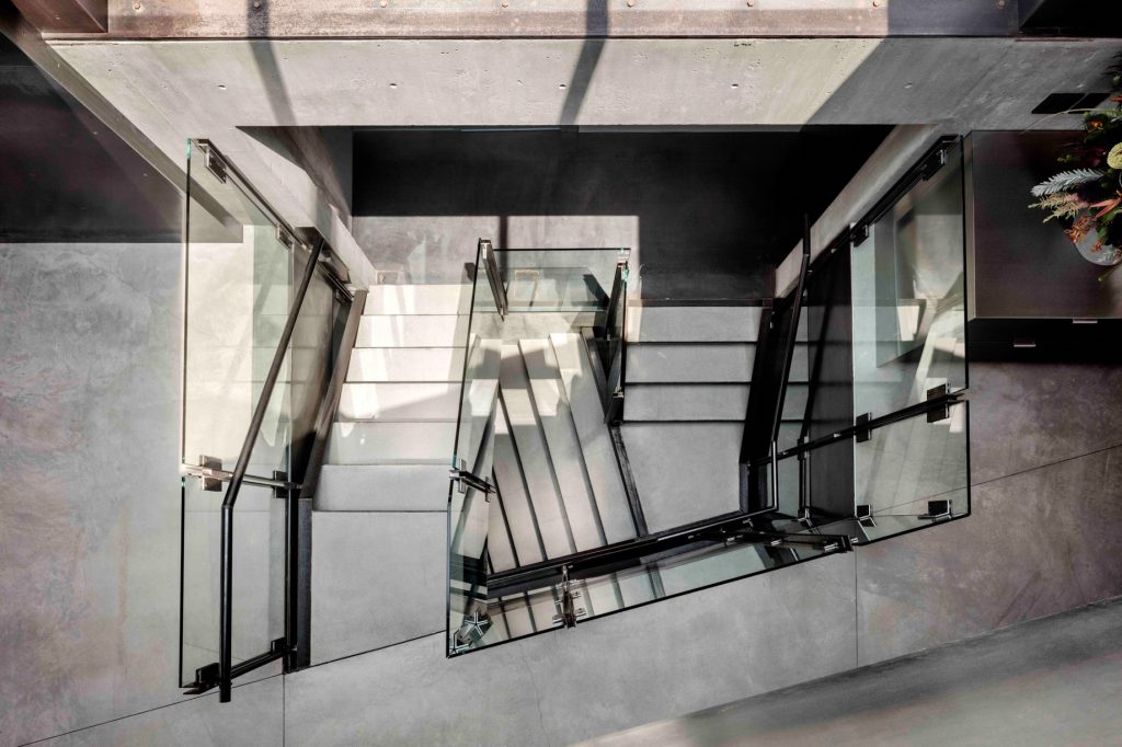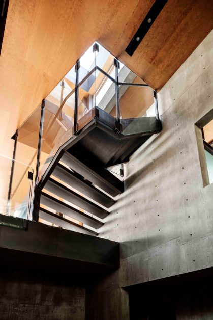 Architect Robin Donaldson led the project with a design process rooted in restraint and intention. The team embraced the site’s physical and regulatory constraints, shaping a cantilevered structure that’s formally expressive and materially honest. A central stair topped by a skylight vertically connects the home’s levels, drawing in natural light and enhancing internal flow. The palette, limited to wood, cast-in-place concrete, steel, and glass, underscores the client’s minimalist aesthetic. Exposed structural elements, Douglas fir-paneled ceilings, and steel detailing create a modern yet tactile interior. The absence of drywall throughout supports a raw, cohesive spatial experience that blurs boundaries between finishes and form.
