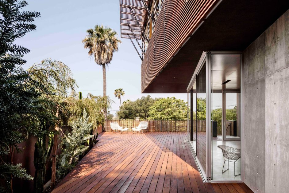 Passive climate strategies are seamlessly integrated into the home’s design. Ipe wood screens shield expansive glazed openings from direct sun while allowing cross-ventilation from ocean breezes. Board-formed concrete walls contribute thermal massing, regulating interior temperatures throughout the day. Low-E glazing minimizes solar heat gain, and a series of outdoor patios foster fluid indoor-outdoor living, turning every corner of the compact site into functional space. The result is a finely detailed, performance-driven home shaped by constraint, collaboration, and a deep connection to its coastal Southern California environment.