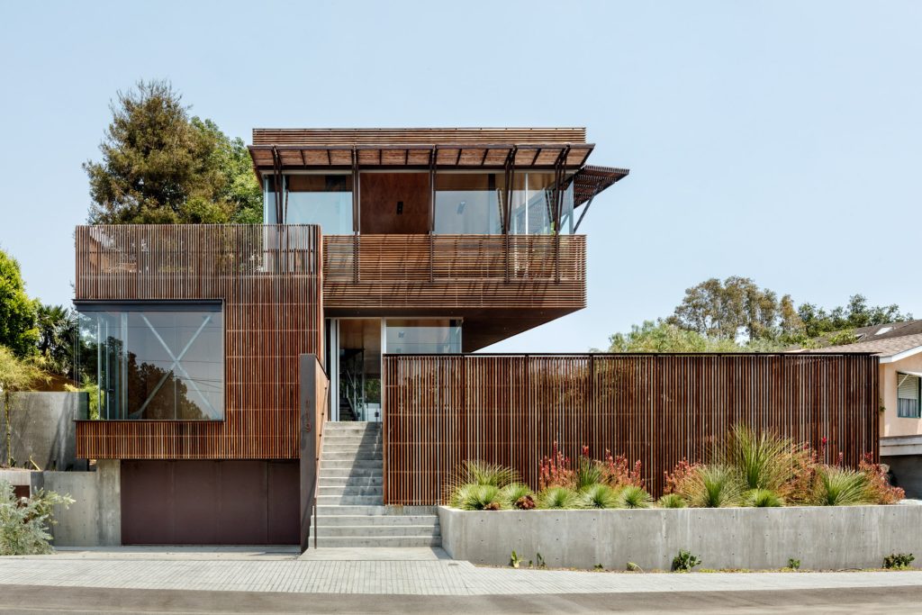 Skyline Residence, by ShubinDonaldson, reimagines coastal living through innovative design. The three-story home maximizes its challenging hillside site, zoning constraints, and Pacific Ocean vistas. The top floor houses open-plan living areas to capture panoramic south- and west-facing ocean views, while the second floor features private bedrooms and a lounge. Below, a partially submerged ground floor accommodates service spaces like a garage and laundry room. A central steel-and-concrete staircase, crowned by a skylight, connects all levels, flooding the interior with natural light. The homeโs angular, cantilevered form, crafted from a restrained palette of wood, glass, steel, and board-formed concrete, responds to the siteโs steep slope and strict building codes, creating a striking yet context-sensitive addition to the suburban neighborhood.