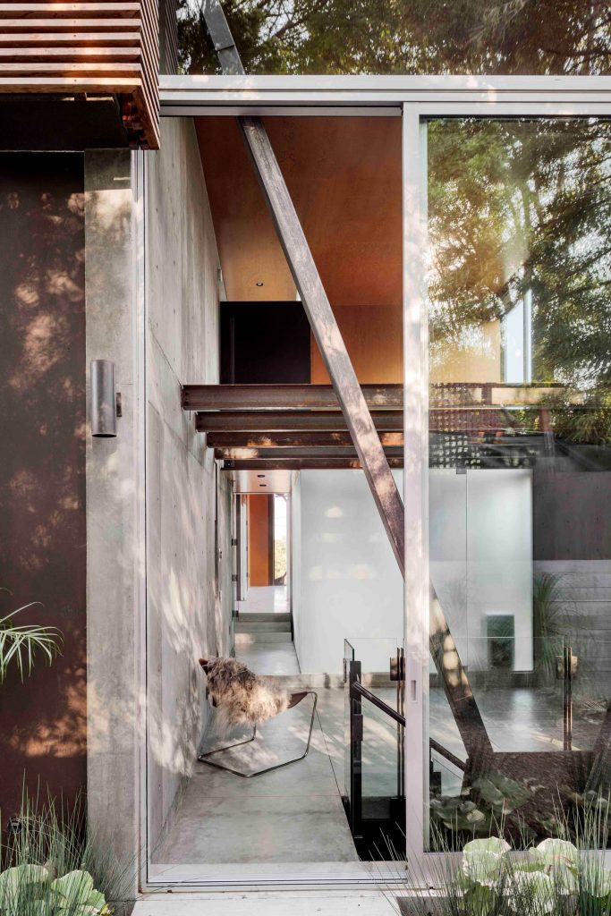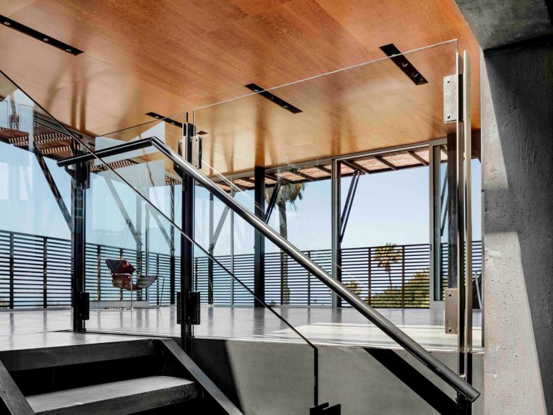 Architect Robin Donaldson led the project with a design process rooted in restraint and intention. The team embraced the siteโs physical and regulatory constraints, shaping a cantilevered structure thatโs formally expressive and materially honest. A central stair topped by a skylight vertically connects the homeโs levels, drawing in natural light and enhancing internal flow. The palette, limited to wood, cast-in-place concrete, steel, and glass, underscores the clientโs minimalist aesthetic. Exposed structural elements, Douglas fir-paneled ceilings, and steel detailing create a modern yet tactile interior. The absence of drywall throughout supports a raw, cohesive spatial experience that blurs boundaries between finishes and form.
