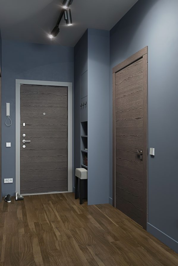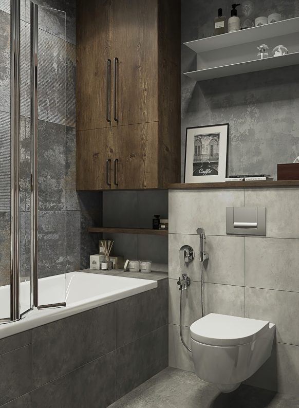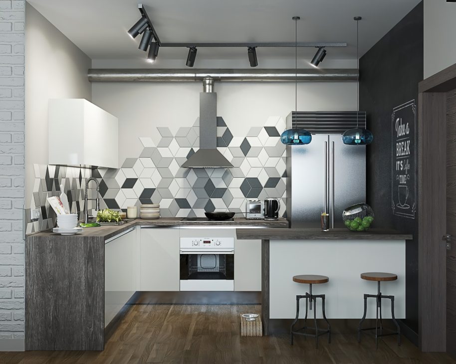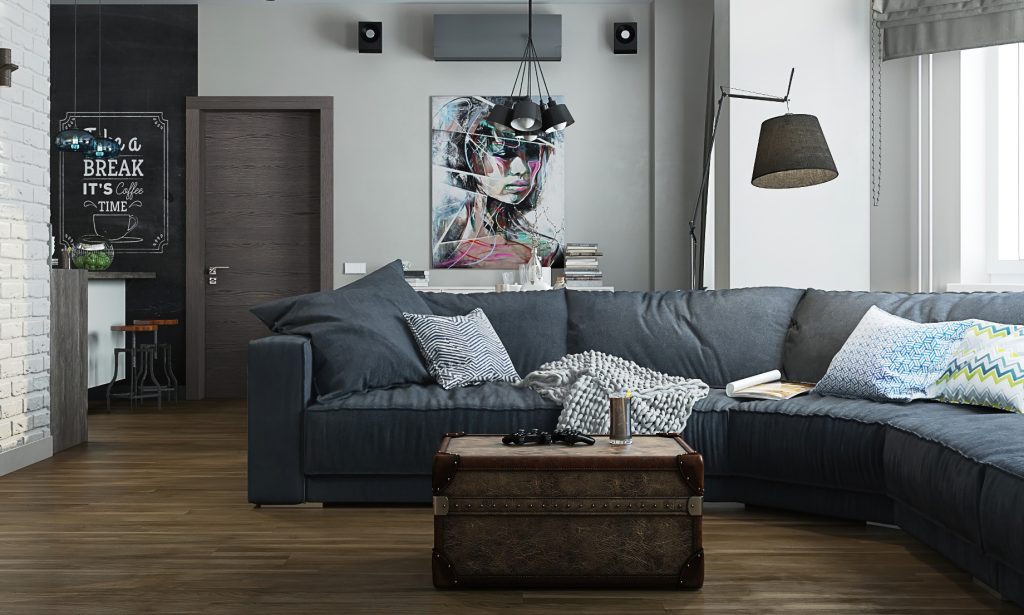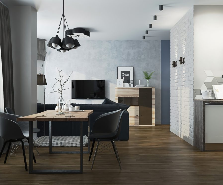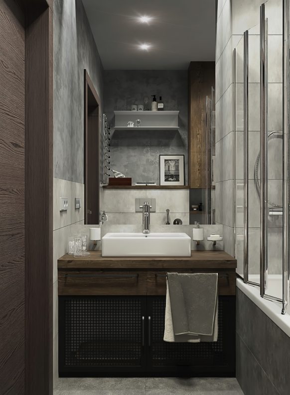 The finishes in this project are very varied. The designers used decorative plaster for concrete, painted brick, colorful apron with rhombuses that fold into cubes. The main flooring is a chocolate-colored laminate. The finishing of the bathroom consists of concrete-look porcelain stoneware, relief porcelain stoneware imitating aged metal, and gray decorative plaster.