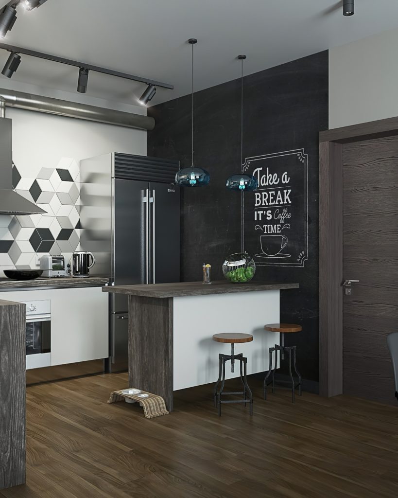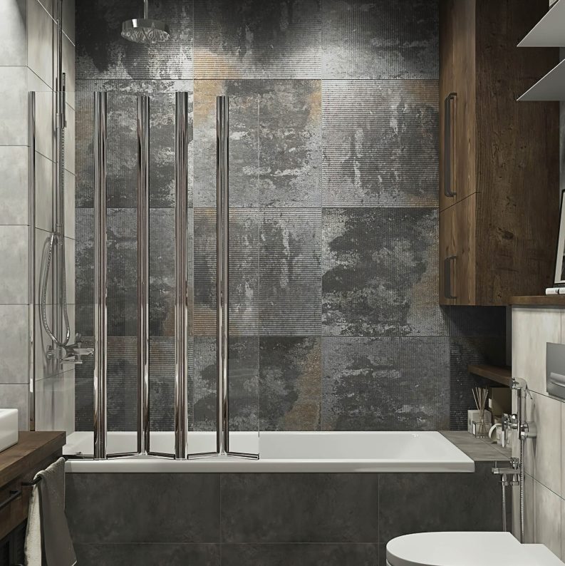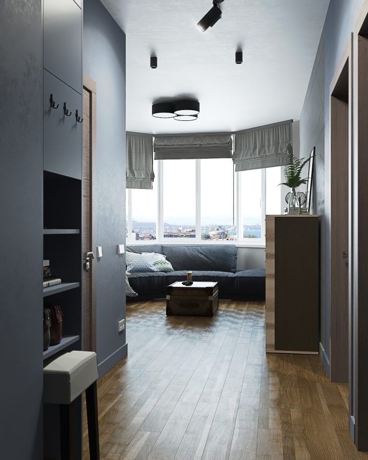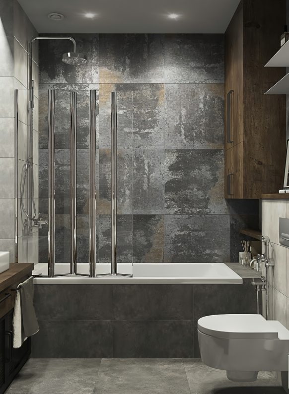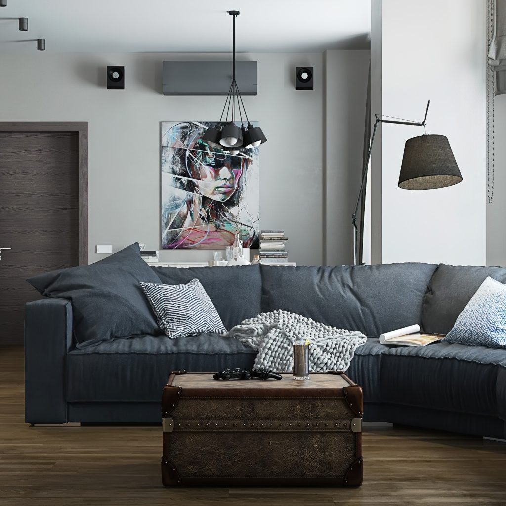 The finishes in this project are very varied. The designers used decorative plaster for concrete, painted brick, colorful apron with rhombuses that fold into cubes. The main flooring is a chocolate-colored laminate. The finishing of the bathroom consists of concrete-look porcelain stoneware, relief porcelain stoneware imitating aged metal, and gray decorative plaster.