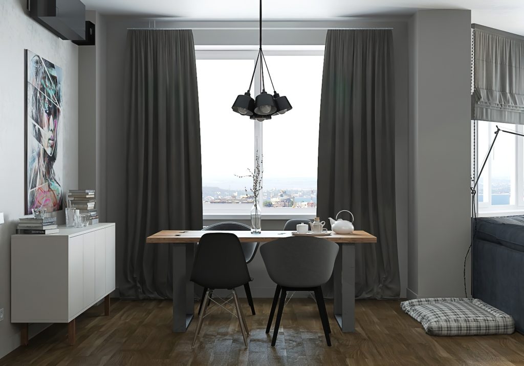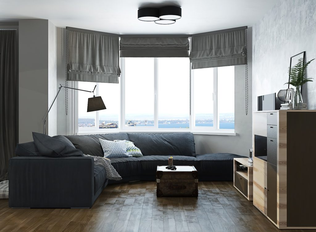 The customers already had some pieces of furniture that needed to fit into the interior. Such elements as the kitchen with an island, cabinet furniture for the living room. As a result, the common space is not cluttered with unnecessary pieces of furniture and includes only the most necessary. The soft zone was made to order according to the shape of the bay window, thus it turned out to organize one big place of attraction for cozy evenings.