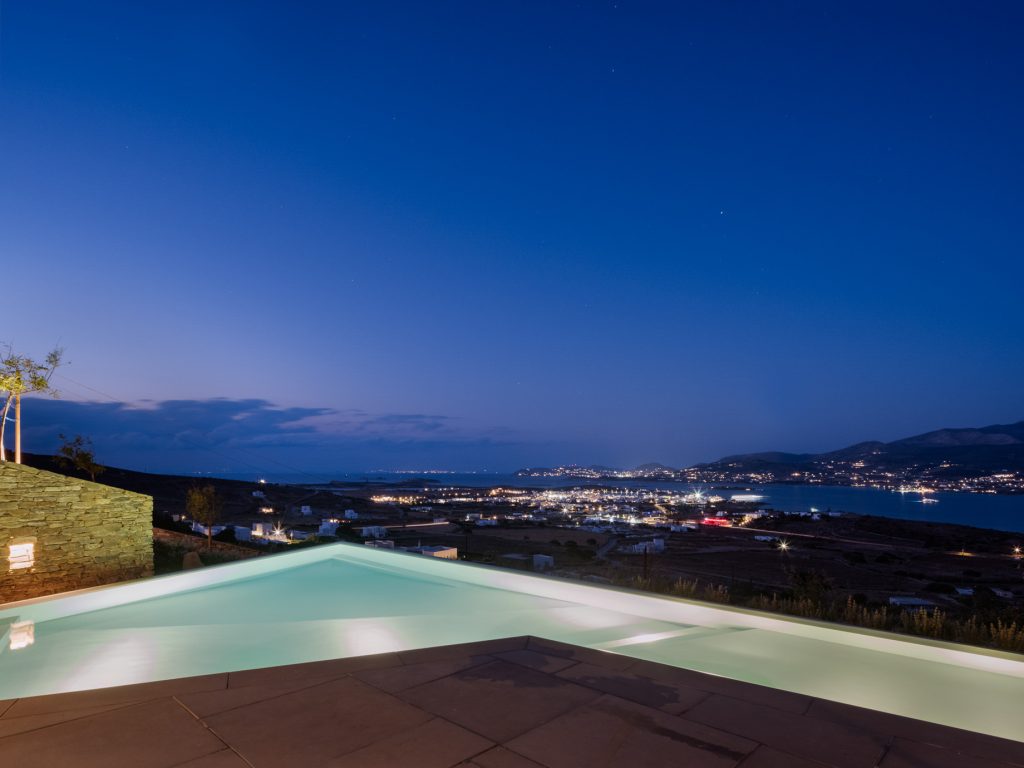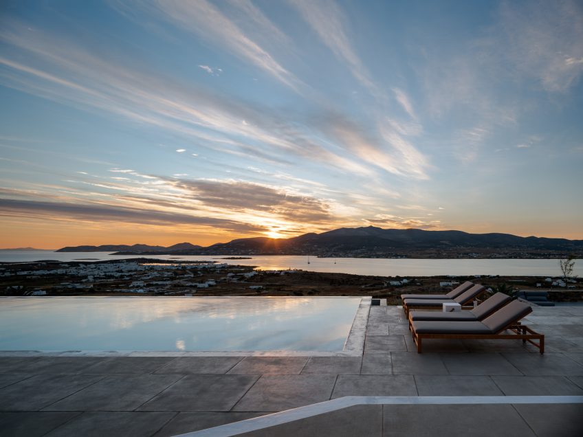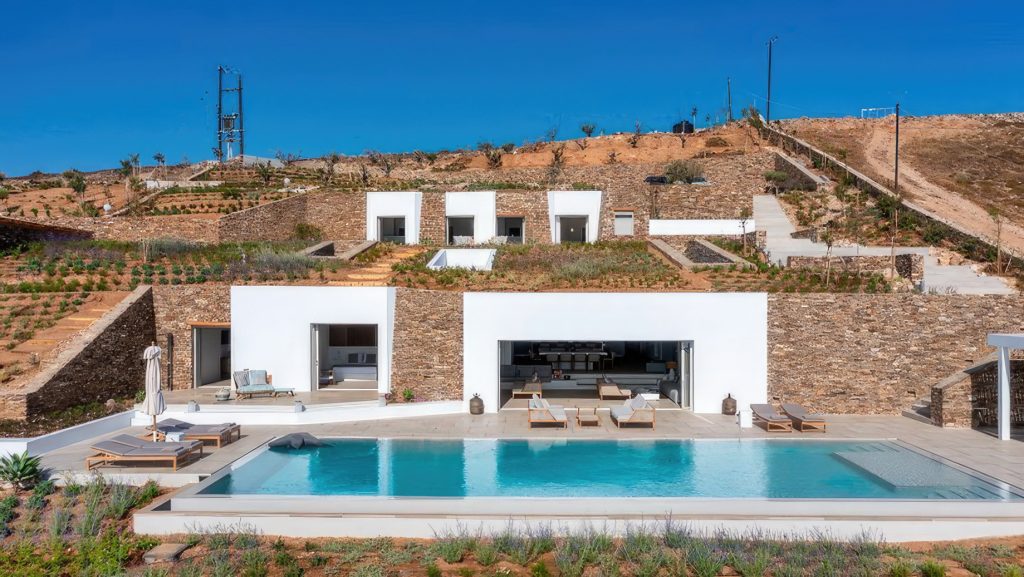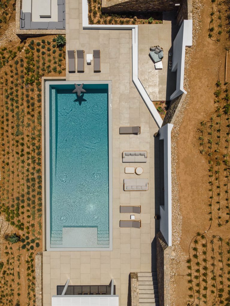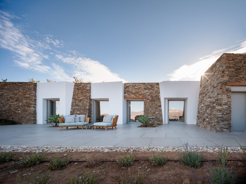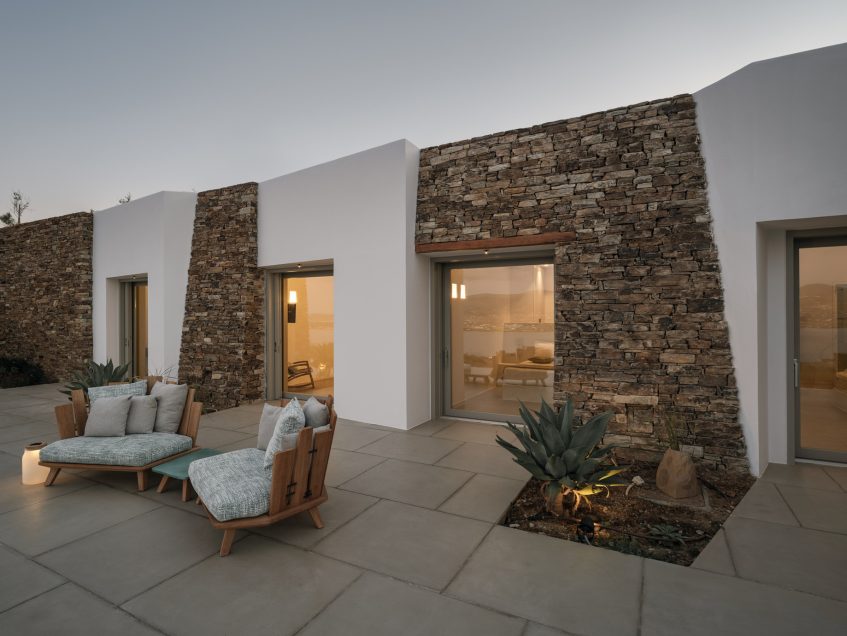 The villa’s facade is a striking combination of “primitive” and “geometric” elements, reflecting both traditional and modern Cycladic architecture. Natural stone was used to anchor the building within its environment, while white plaster segments provide a contemporary reinterpretation of the island’s rock formations. This careful interplay between materials and design not only preserves the essence of Cycladic architecture but also introduces a modern aesthetic that feels both timeless and innovative. Inside, the villa is designed to foster a strong connection between indoor and outdoor spaces, with features such as indoor atriums, elongated slits for natural light, and contemporary sliding frames that allow for seamless transitions between the two.