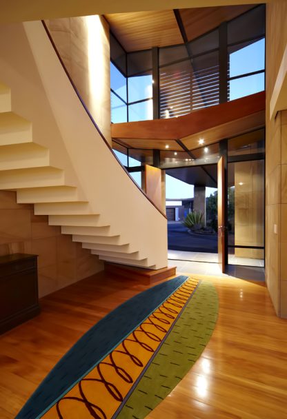 Built to be an outstanding coastal property on a 1.8ha lifestyle block, the principal structure of the Sullivan House Residence is ordered by a curved spine that runs throughout its length and separates the private from the public spaces with formal areas that are generally treated with larger volumes of double height space in contrast to more intimate spaces for the private and family areas. Each turn and twist in the free-flowing plan opens up to a unique and unexpected tranquil view of the peaceful surroundings and the magnificent Whitford coastline.