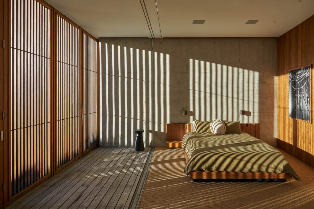 This same theme continues on the first floor, where the entire living space opens up via perpendicular sequences of floor-to-ceiling glazed doors, and the interior becomes a deck hovering over the landscape, from which one gazes across the ocean to the horizon.