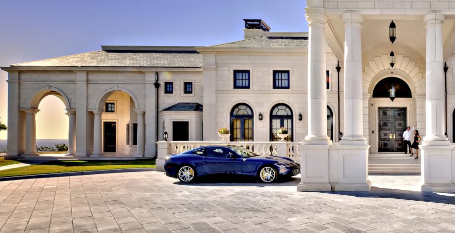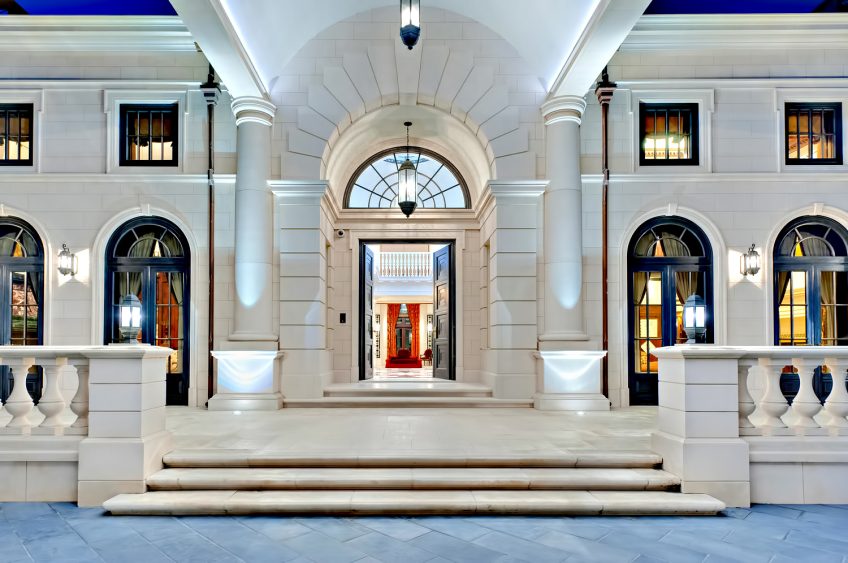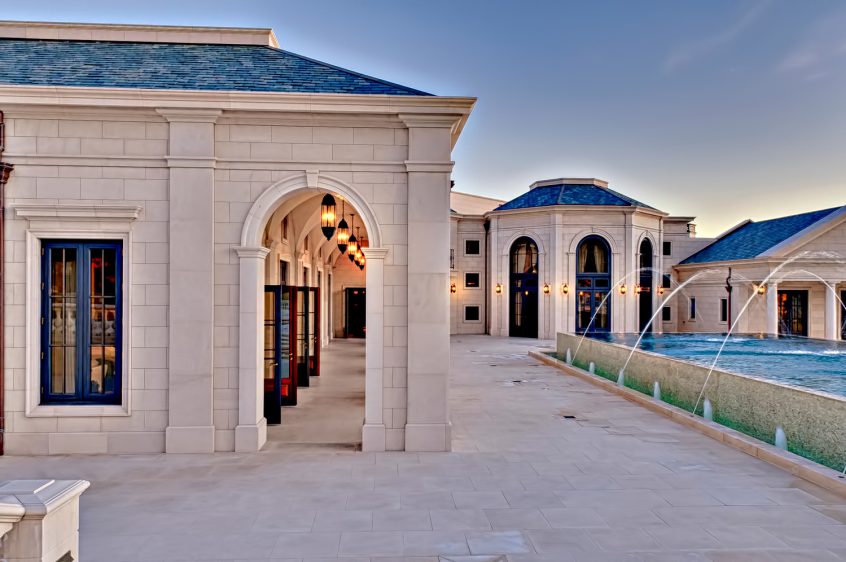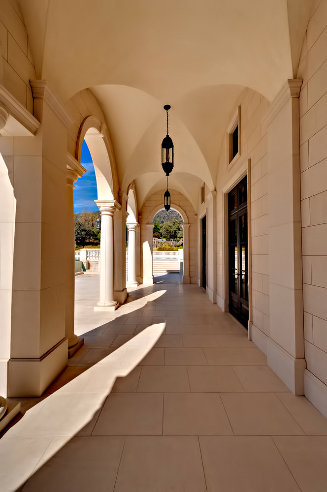 There is close to one acre of porches, decks, loggias, and walkways hewn of French limestone. One is brought to the Main House, elevated in a Palladian Neo-Classical style by way of a dramatic 600-foot Blue Stone private entry drive that ends in a circular flow entrance that allows for 60-foot truck access, or multiple limousines. The property is served by its own dedicated fire hydrant and has a 2.5-inch fire line that encircles the entire building pad.
