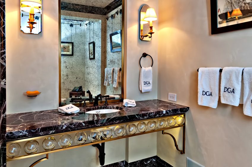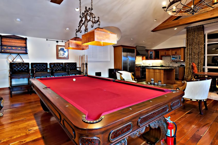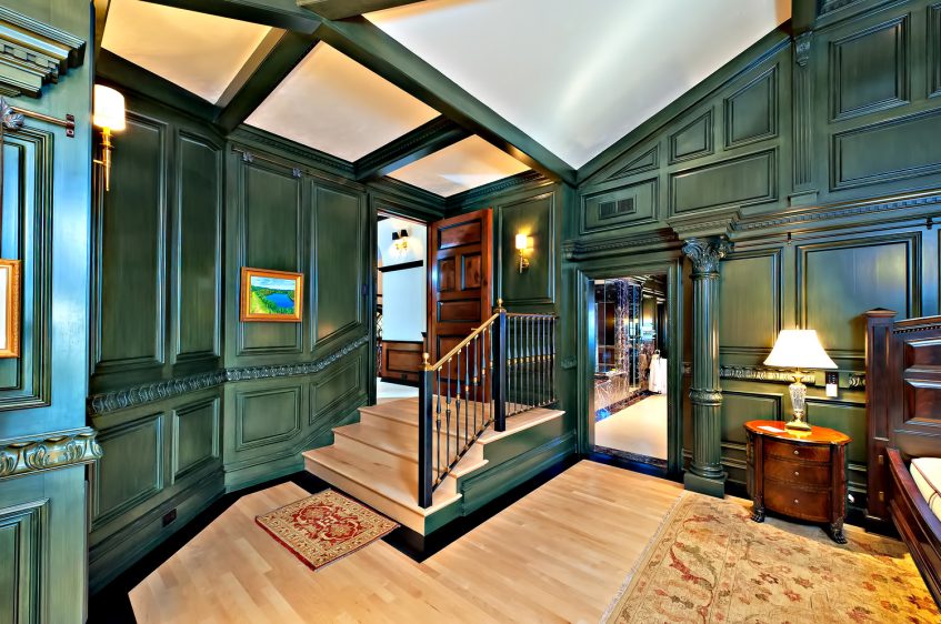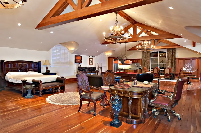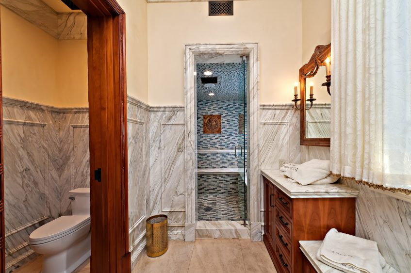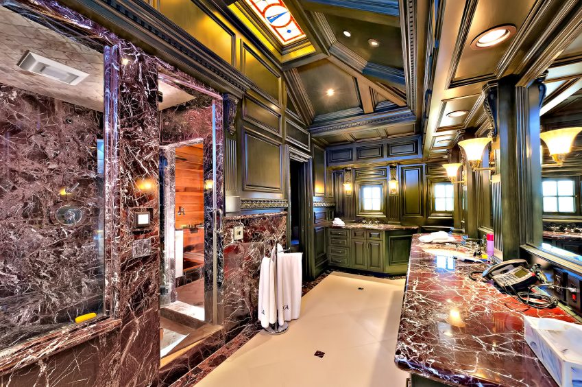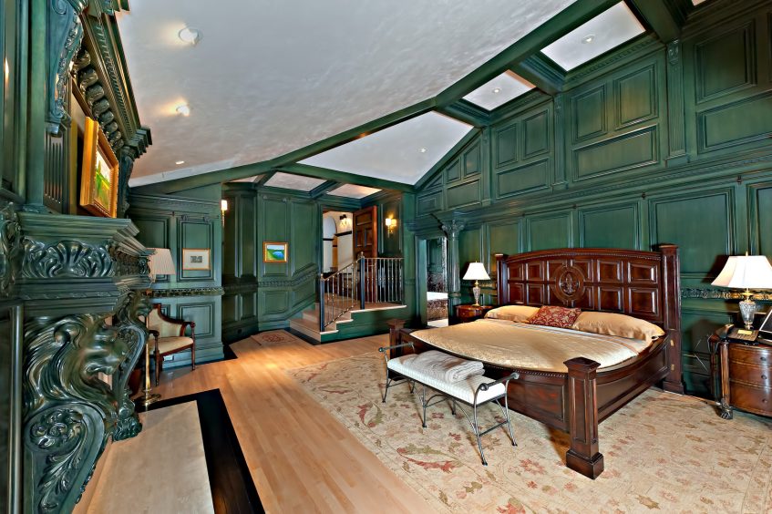 The detached Guesthouse with full kitchen sits above the 10 car Garage, both totaling 6,700 sq. ft. From the hand-rubbed cherry wood floors to the forged iron custom made chandelier, this private guest retreat offers all amenities a guest could enjoy including the top of the line sound system throughout and elegant custom pool table. On a lower level is the workshop, driver/security room as well as staff quarters that include a bedroom with massive shower.