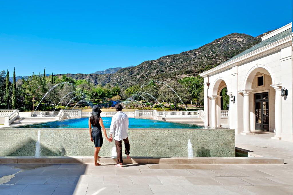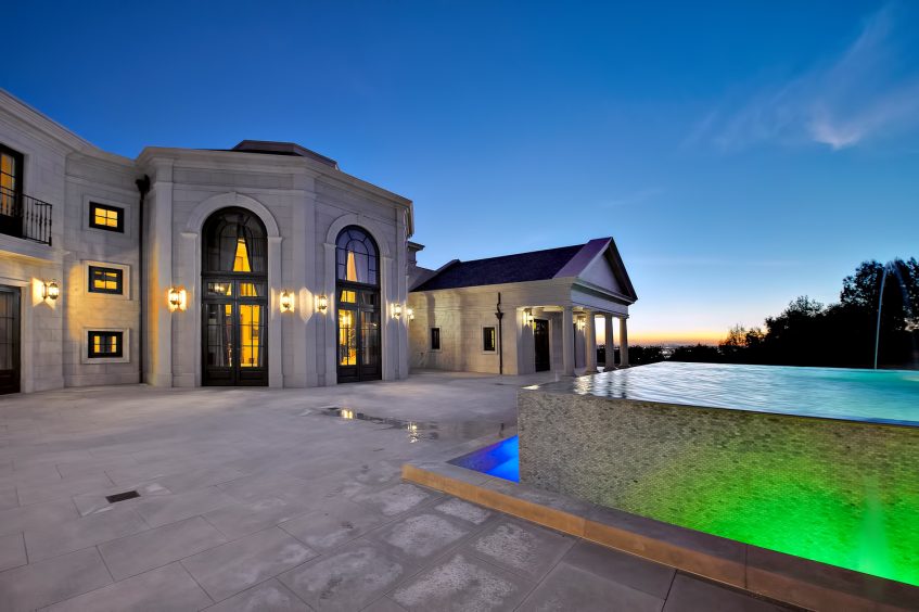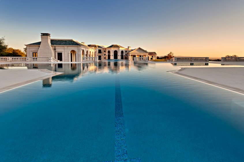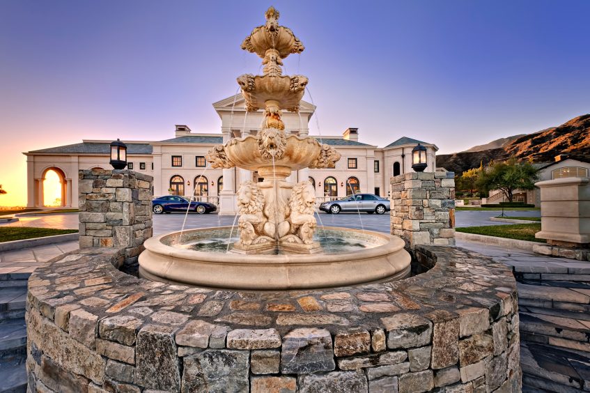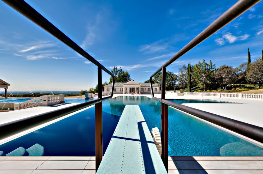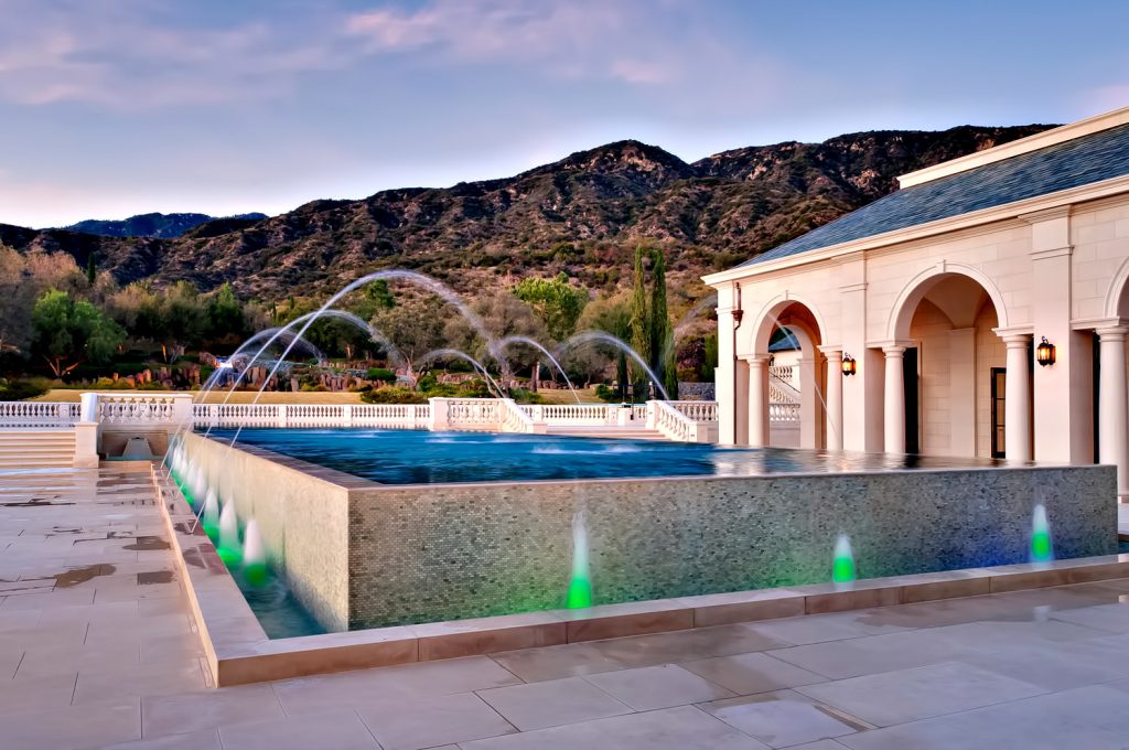 The almost 8 acres provide an exquisite setting for the sparkling diamond of a pool, elevated with an infinity-edge, placed center courtyard, with 350,000-gallons; itβs just a few feet short of Olympic length with depths up to 14 feet. Other exterior features include a 15 person Jacuzzi, and a temperature-controlled Trout Pond with a 2 story Waterfall. The 1,000,000-gallon capacity pond is stocked with rainbow trout and mallard ducks; the only one of its kind in California. It is adorned with perennials that bloom at various times in the year and drop into the beautiful cliff stone surrounding the entire pond. The water is heated by a custom gravity separator with UV filters, and is chilled for the trout by a 300-ton central cooling plant.