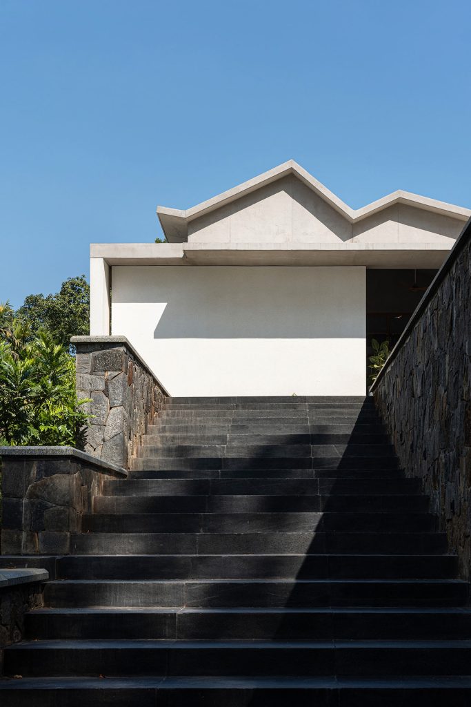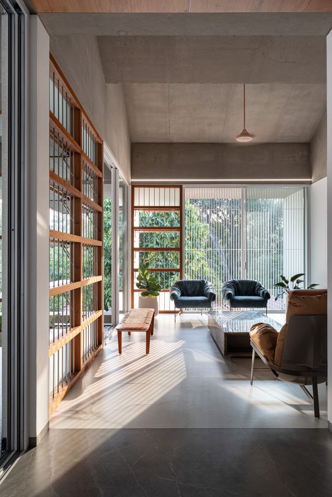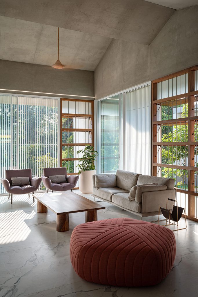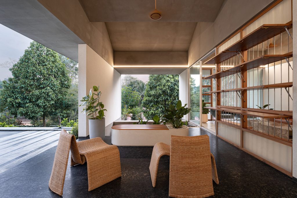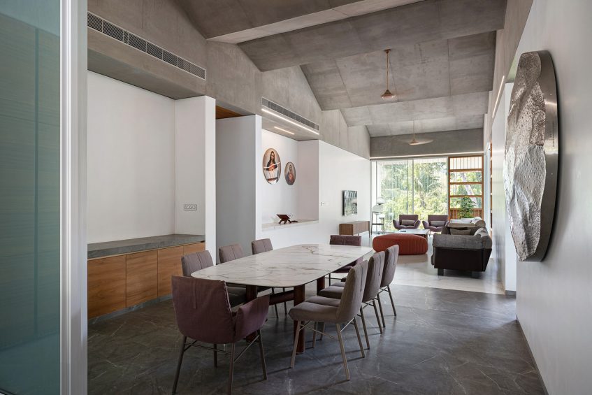 Designed to seamlessly integrate with its surroundings, the home sits gracefully on a 2.5-acre site with naturally sloping terrain. The layout strategically arranges the main living areas at an elevated level, with auxiliary spaces placed along the incline. A central spine connects three distinct zones: a formal area with a private office and living room, a family hub featuring a dining room and kitchen, and a private wing with five bedrooms. Large windows fitted with vertical metal louvre screens invite ample natural light while maintaining privacy, fostering an open yet serene living experience. The interiors are thoughtfully curated with natural materials like teak wood and vitrified tiles, striking a balance between minimalist design and practicality. Custom furniture and a rotating stainless-steel artwork further elevate the homeโs visual appeal, blending functionality with artistic expression.
