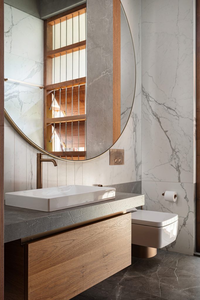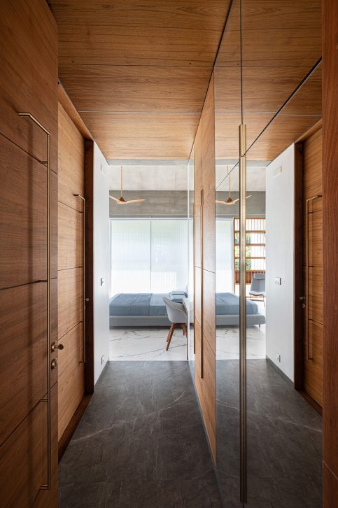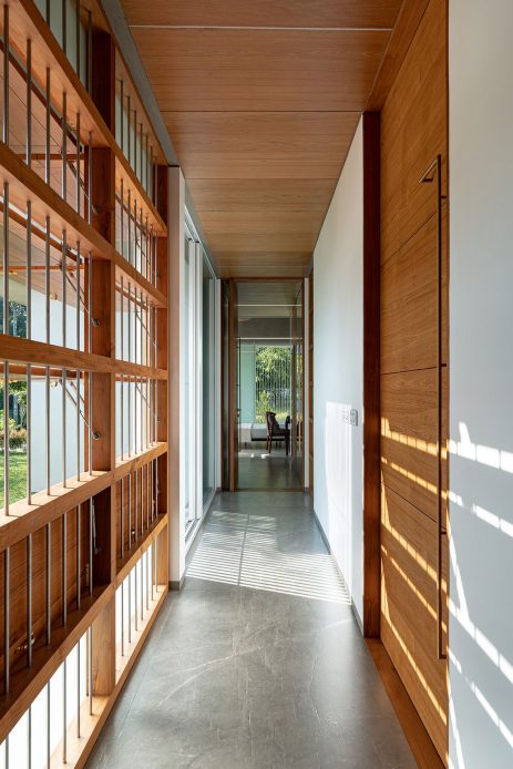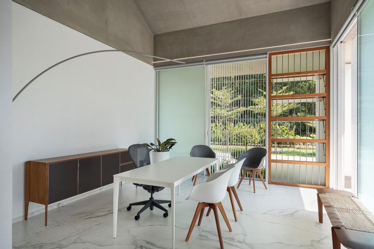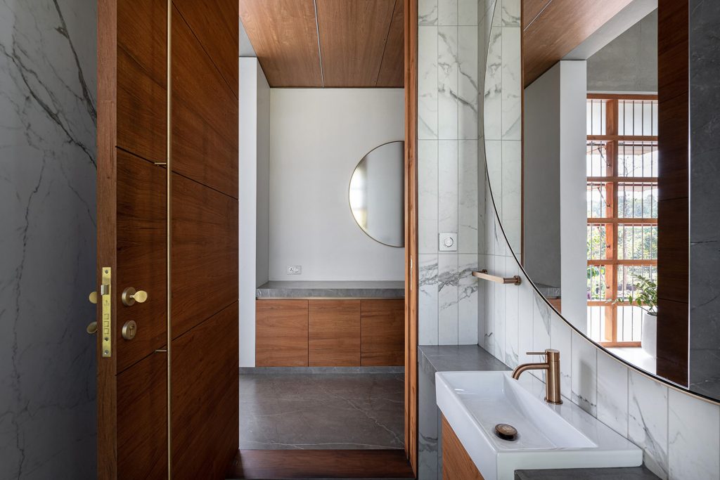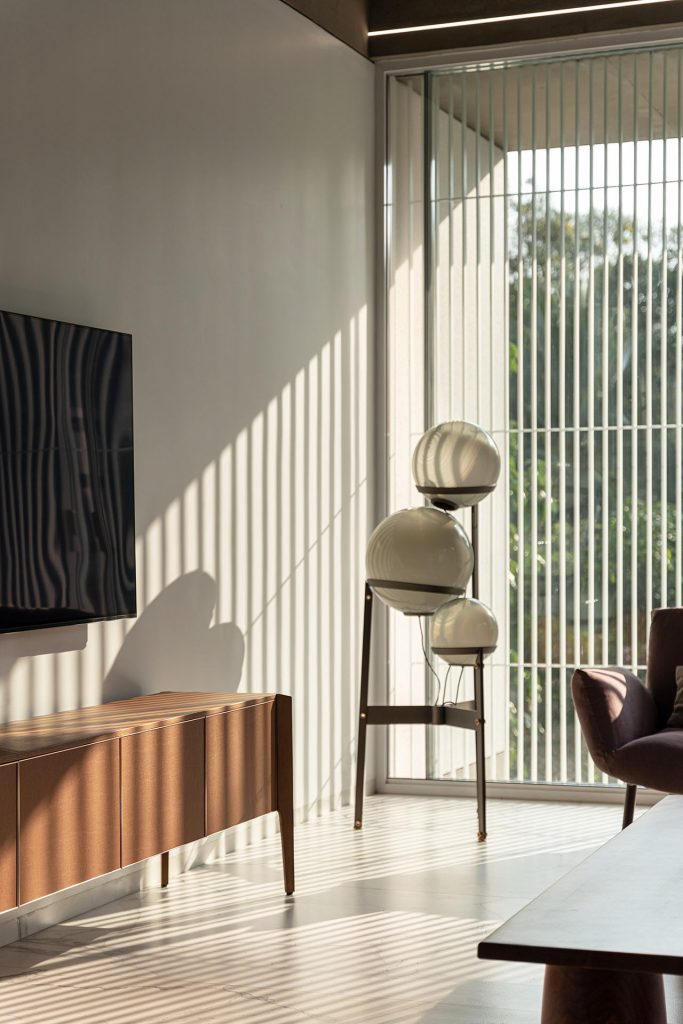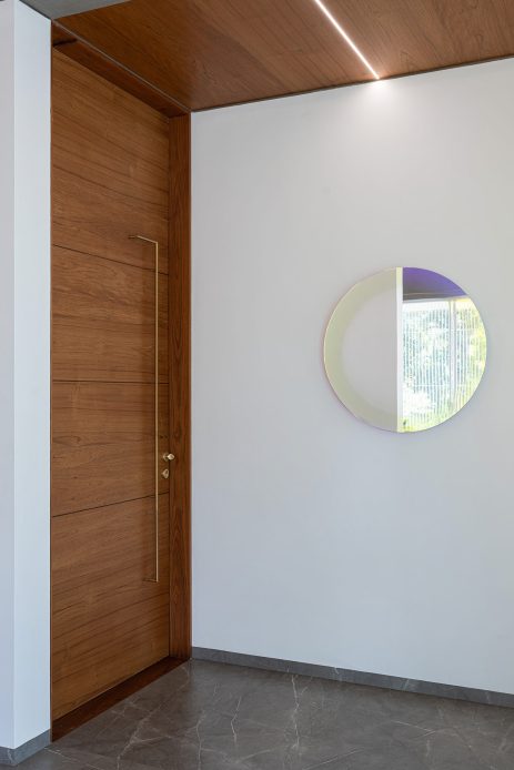 Designed to seamlessly integrate with its surroundings, the home sits gracefully on a 2.5-acre site with naturally sloping terrain. The layout strategically arranges the main living areas at an elevated level, with auxiliary spaces placed along the incline. A central spine connects three distinct zones: a formal area with a private office and living room, a family hub featuring a dining room and kitchen, and a private wing with five bedrooms. Large windows fitted with vertical metal louvre screens invite ample natural light while maintaining privacy, fostering an open yet serene living experience. The interiors are thoughtfully curated with natural materials like teak wood and vitrified tiles, striking a balance between minimalist design and practicality. Custom furniture and a rotating stainless-steel artwork further elevate the homeโs visual appeal, blending functionality with artistic expression.