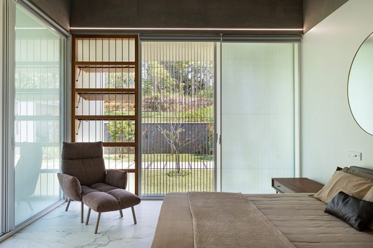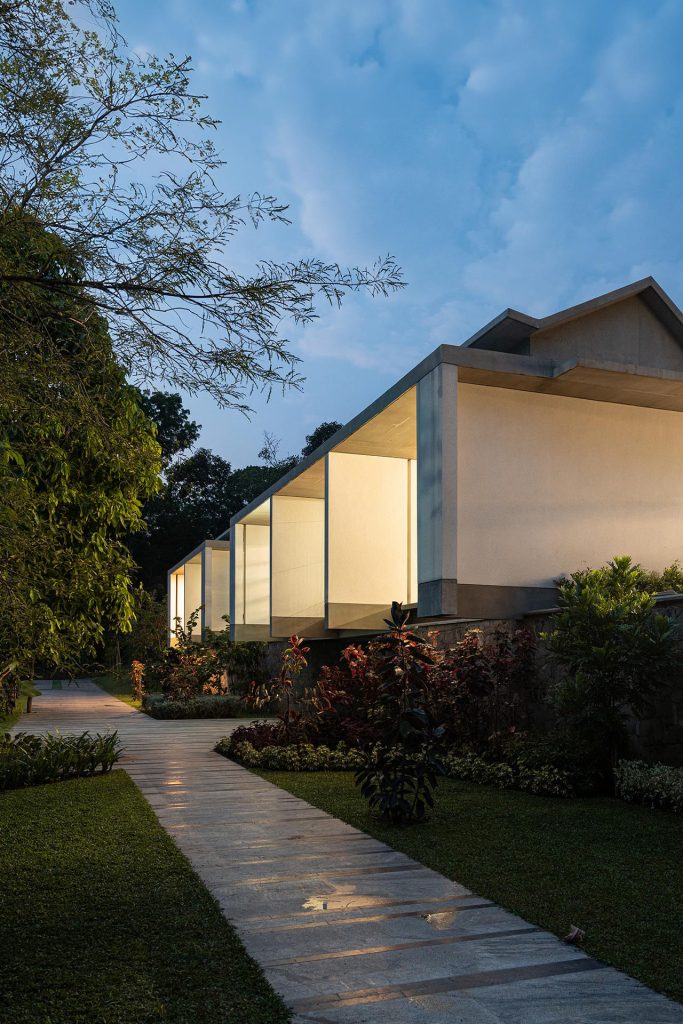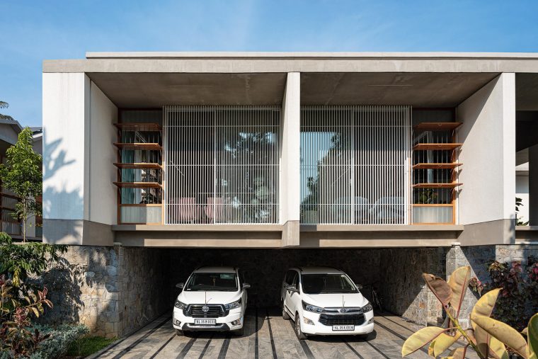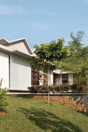 Crimped Roof House, designed by LIJO.RENY.architects, is a single-story home that redefines modern architectural design in India by merging regional sensibilities with contemporary innovation. The house’s standout feature is its undulating roof, a reinforced cement concrete structure that creates dramatic spatial variations while enhancing natural ventilation and passive cooling. This thoughtful approach not only minimizes energy consumption but also allows the house to remain cool during Keralaโs sweltering summers, making it a benchmark for climate-responsive architecture. The layout of the Crimped Roof House prioritizes fluidity and connection. A central spine divides the home into three distinct zones: a formal area with a private office and living room, a family zone housing the kitchen and dining area, and five bedrooms. Large windows with vertical metal louver screens inspired by Japanese minimalism blur the boundary between indoors and outdoors, allowing abundant natural light and ventilation.